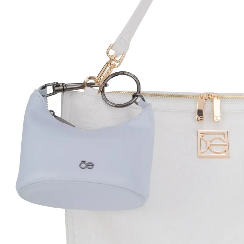 Charm desprendible de bolso Hobo hecho con material vegano apariencia piel. Cuenta con cierre metálico de larga duración. Tiene herraje metálico de monograma. Capacidad ultra pequeña de almacenaje.