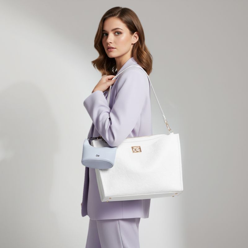 - Material vegano apariencia piel - Cierre de larga duración - Herraje metálico de monograma - Asa corta con broche para colgar - 13 X 8 X 13 CM