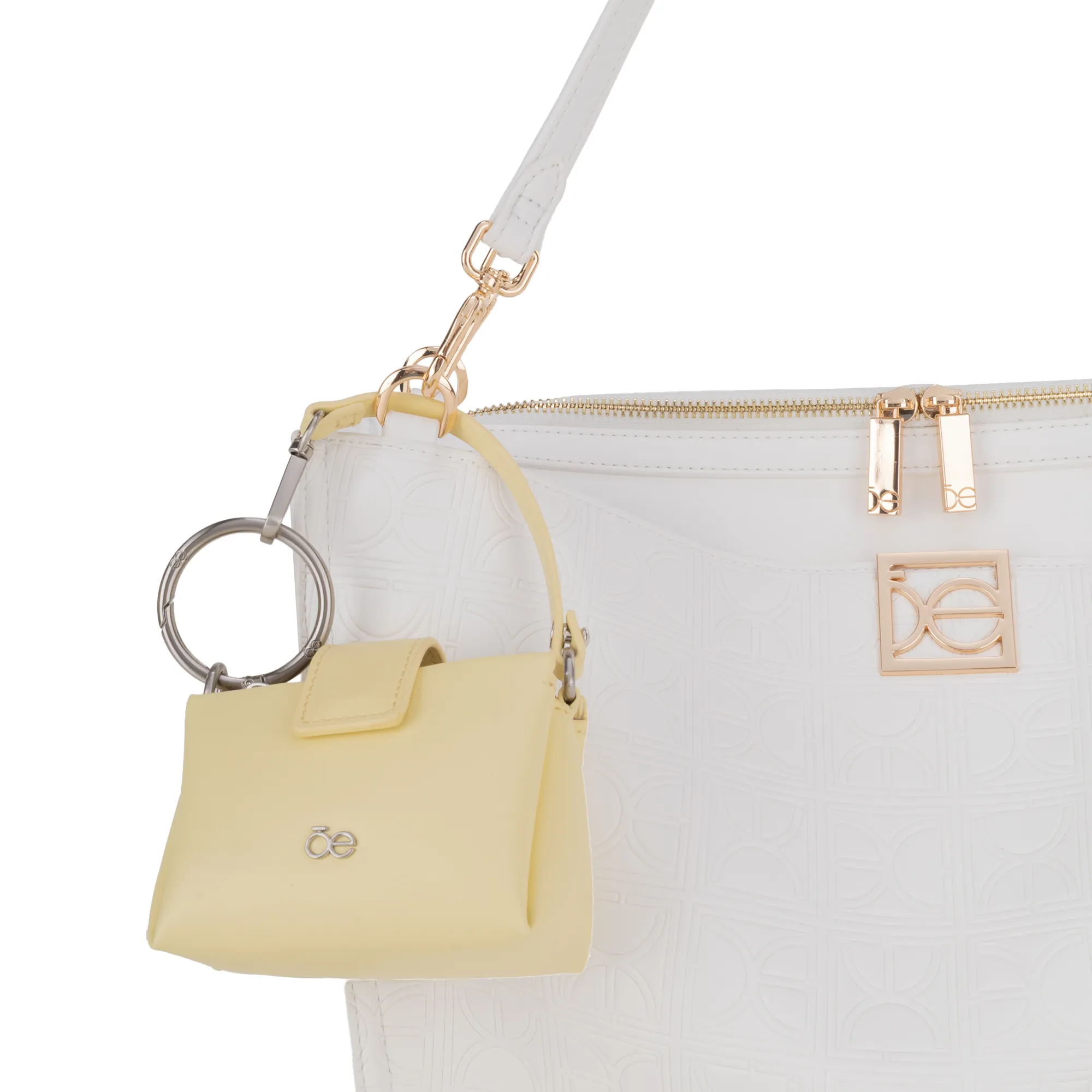 Charm desprendible de bolso satchel hecho con material vegano apariencia piel. Cuenta con cierre metálico de larga duración. Tiene herraje metálico de monograma. Capacidad ultra pequeña de almacenaje.