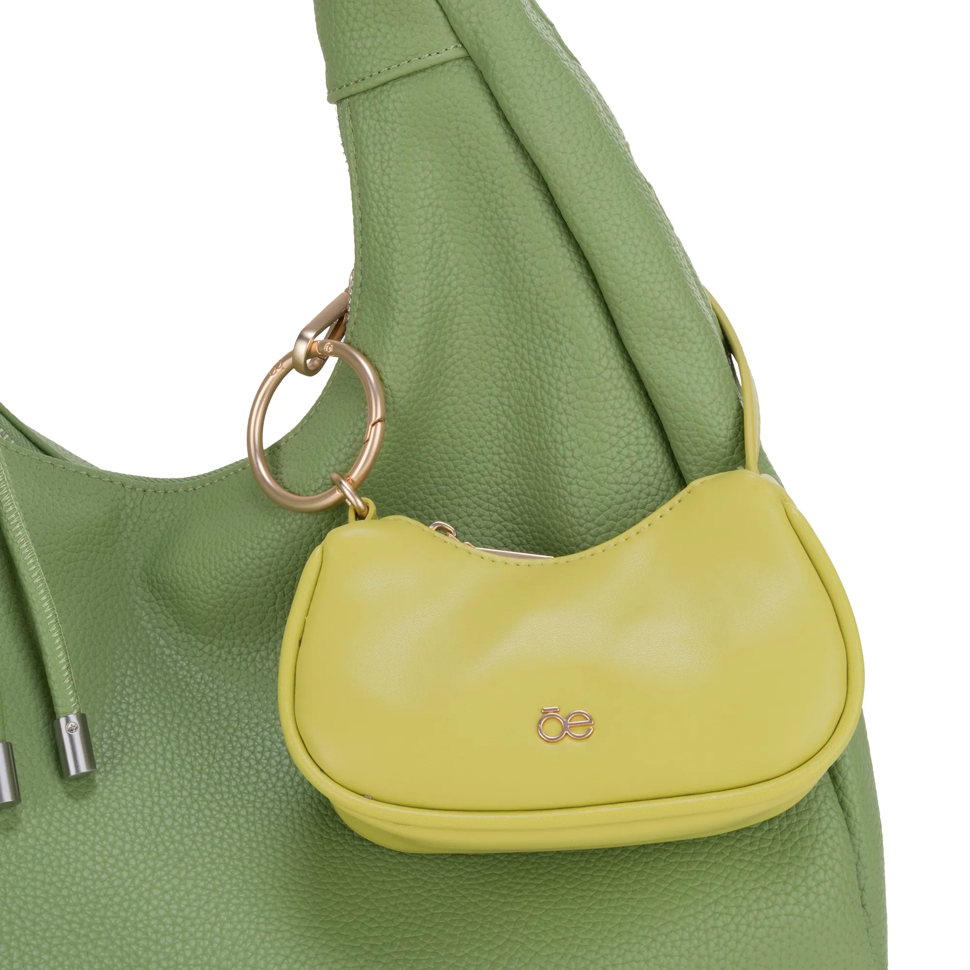 - Material vegano apariencia piel - Cierre de larga duración - Herraje metálico de monograma - Asa corta con broche para colgar - 14 X 6 X 8 CM