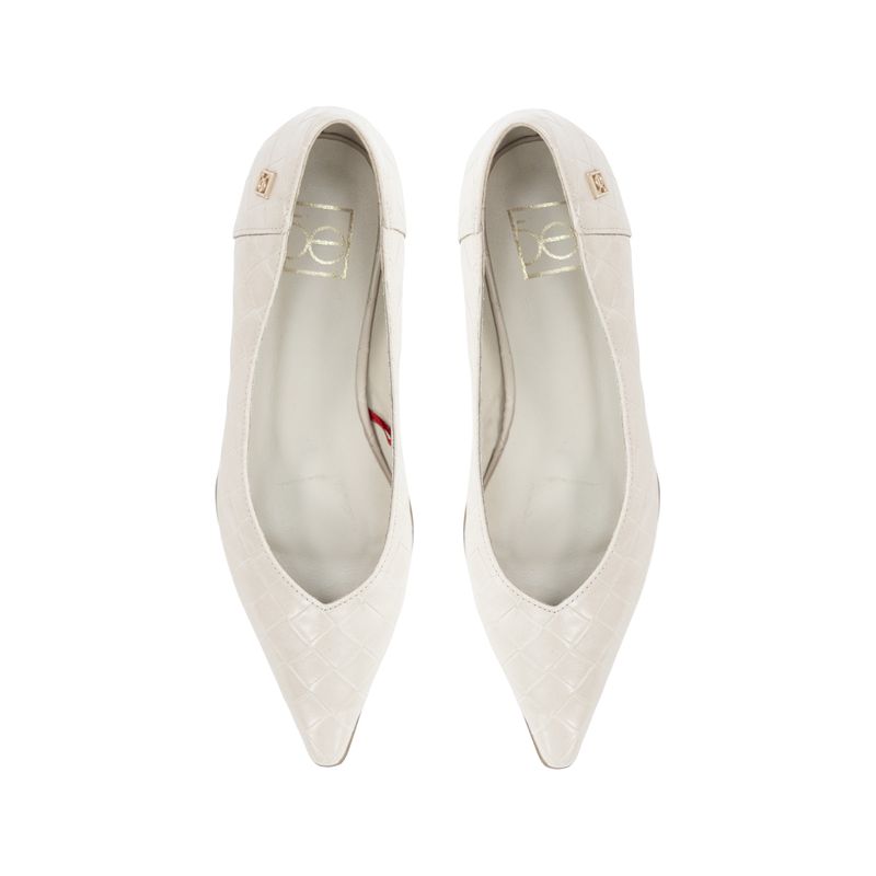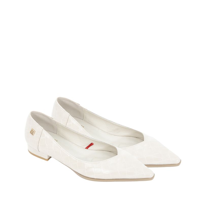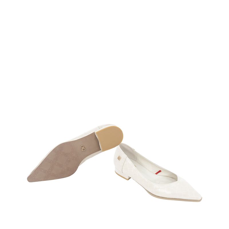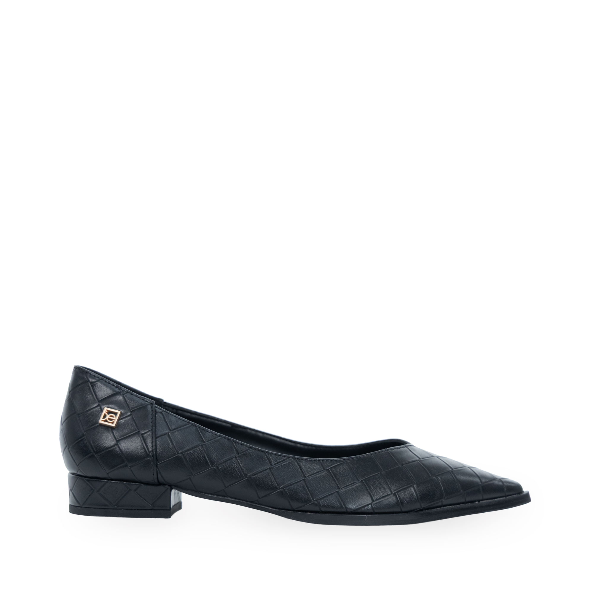 Balerina hecha con material vegano apariencia piel look tejido. Cuenta con diseño puntal de alta tendencia. Cuenta con tacón antiderrapante.