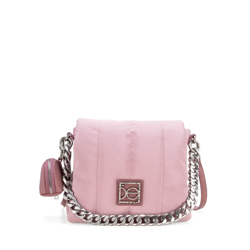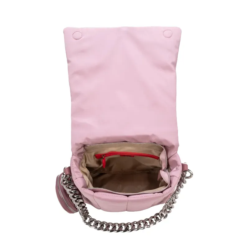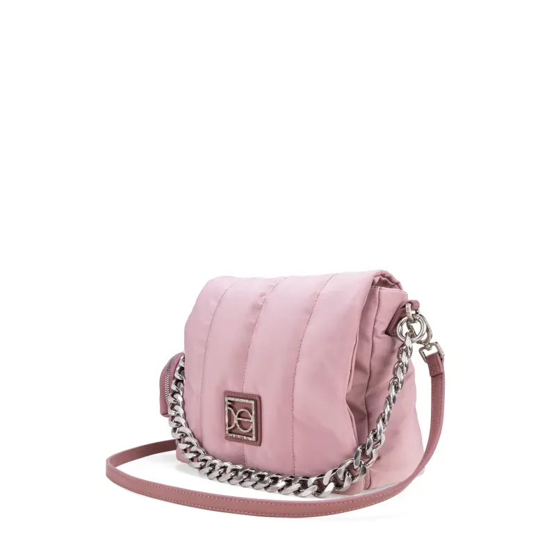 Bolso hecho con material textil. Cuenta con broche magnético. Tiene cierre metálico de larga duración. Look Puffy. Herraje de monograma. Monedero desprendible. Compartimento posterior con broche magnético. Asa corta de cadena. Asa larga ajustable y removible.
