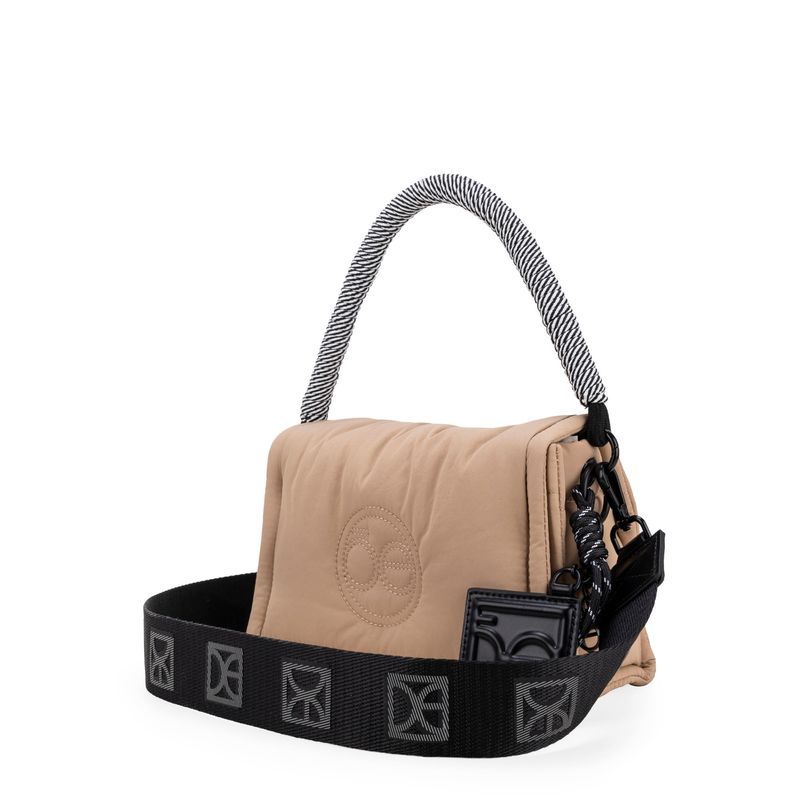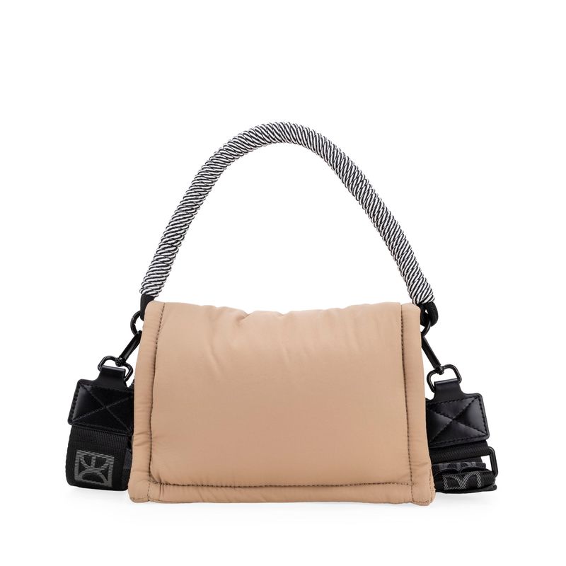 Bolso Briefcase hecho con material textil. Diseño acolchado de alta tendencia. Cuenta con solapa con broches magnéticos. Charm decorativo desprendible. Asa larga ajustable y removible.