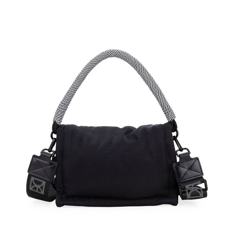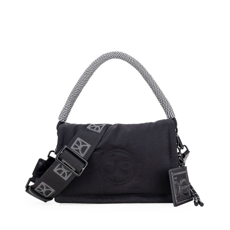 Bolso Briefcase hecho con material textil. Diseño acolchado de alta tendencia. Cuenta con solapa con broches magnéticos. Charm decorativo desprendible. Asa larga ajustable y removible.