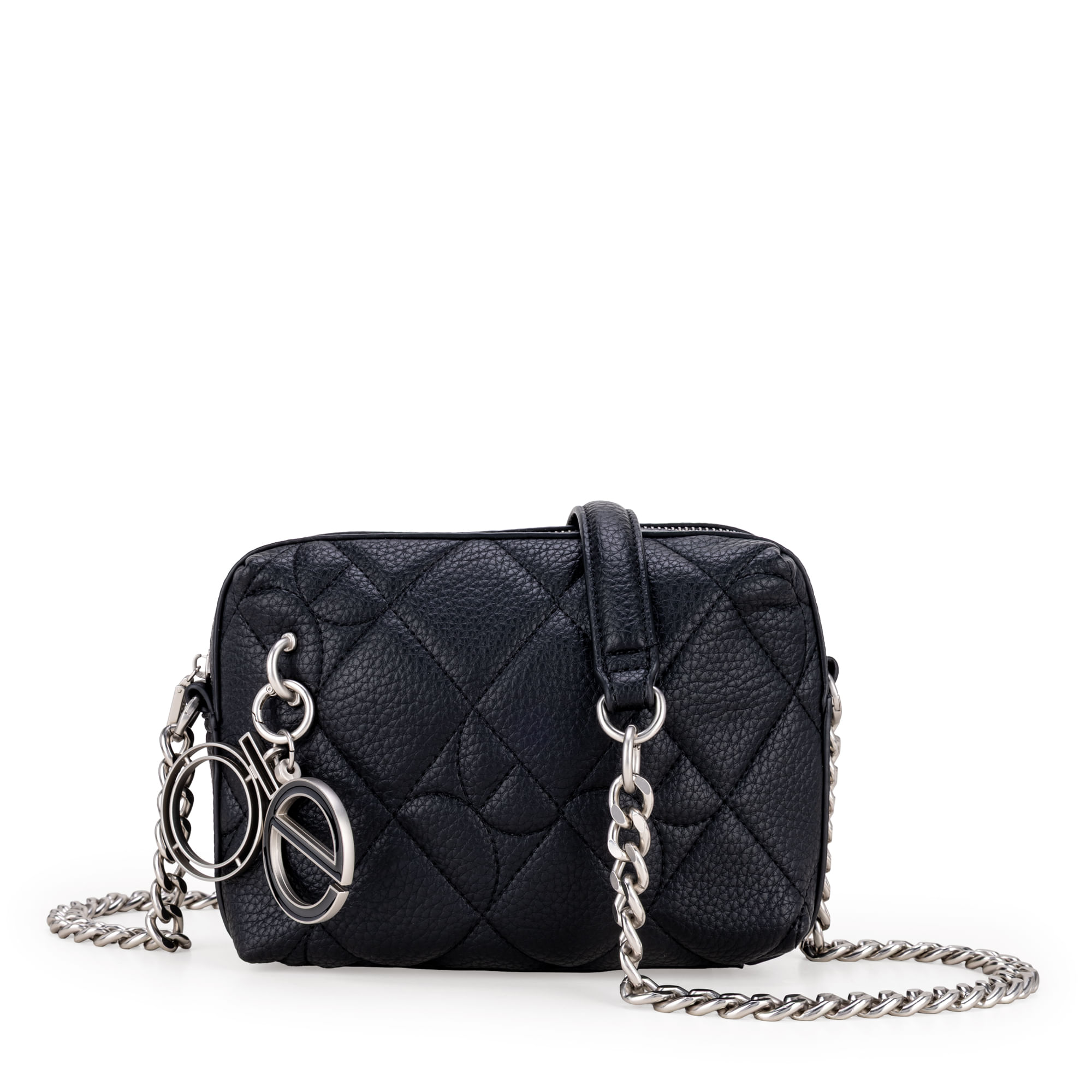 Bolso Crossbody hecho con material vegano apariencia piel. Cuenta con diseño de rombos bordados. Tiene cierre metálico de larga duración. Incluye charm decorativo desprendible. Asa larga de cadena, ajustable.