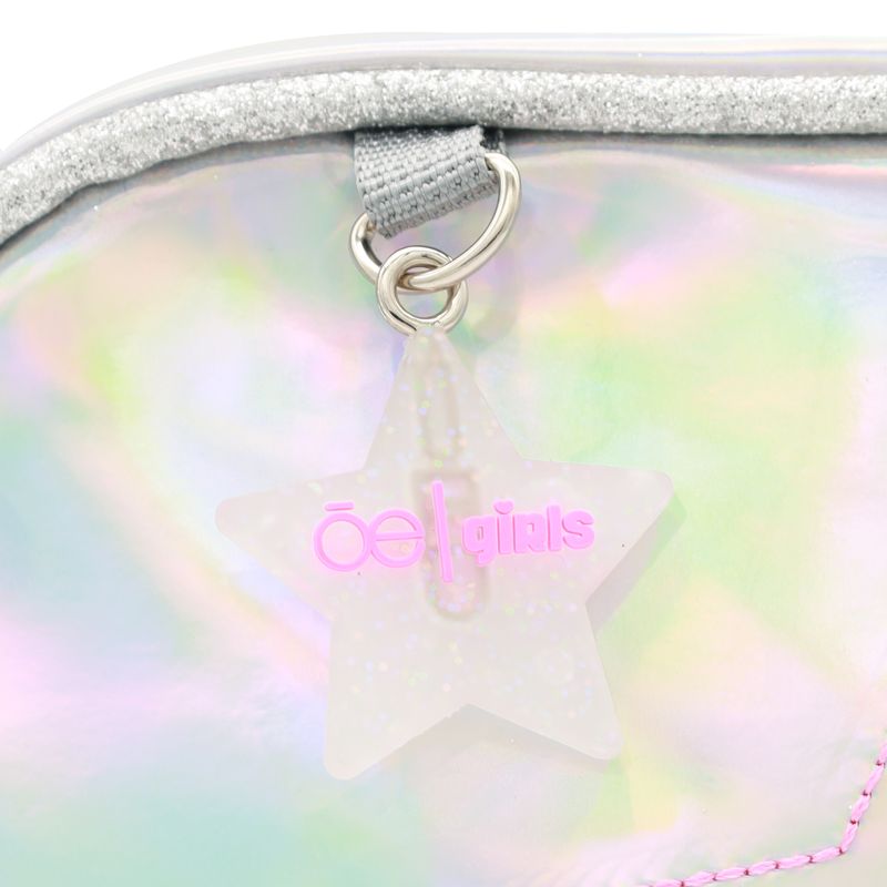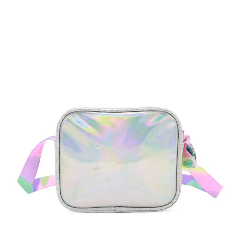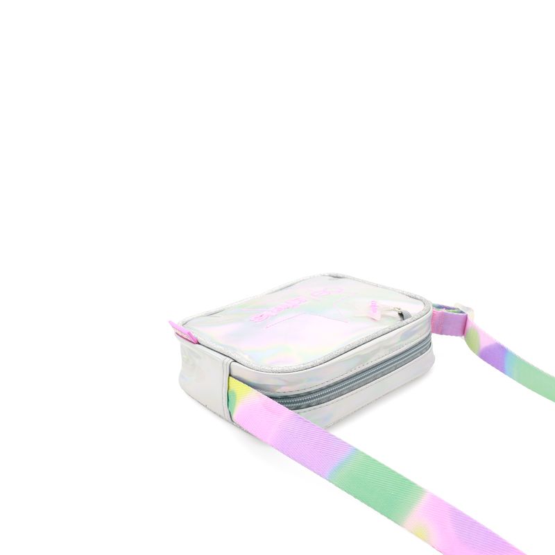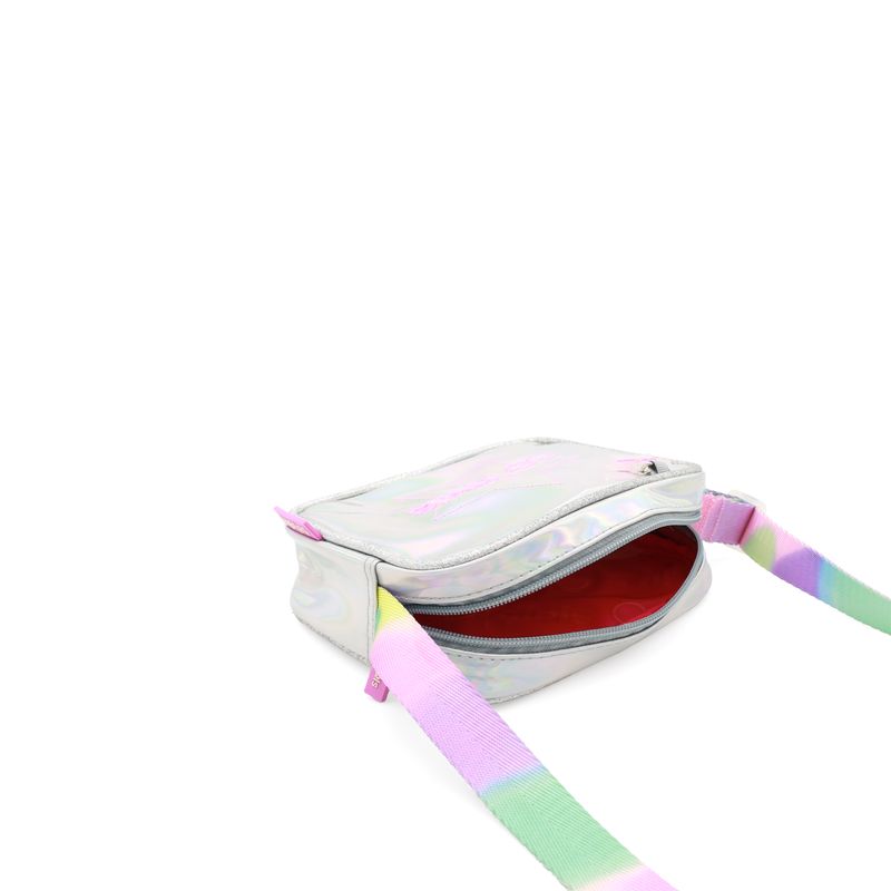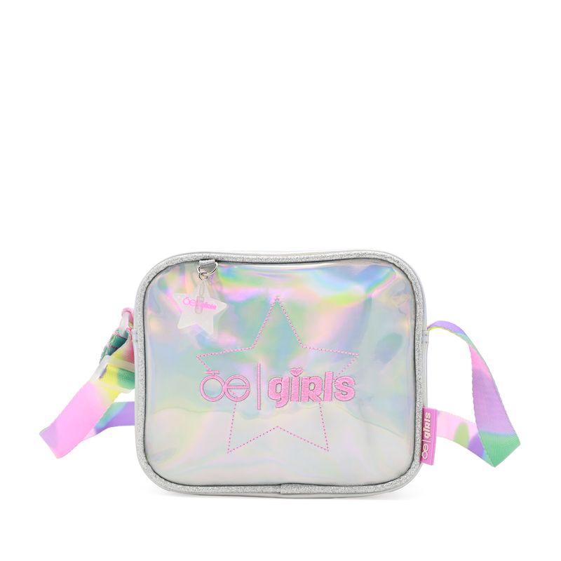 Bolso Crossbody hecho con material mica holográfica. Cuenta con bordado de monograma en estrella. Tiene charm decorativo. Cierre de larga duración. Asa larga ajustable.