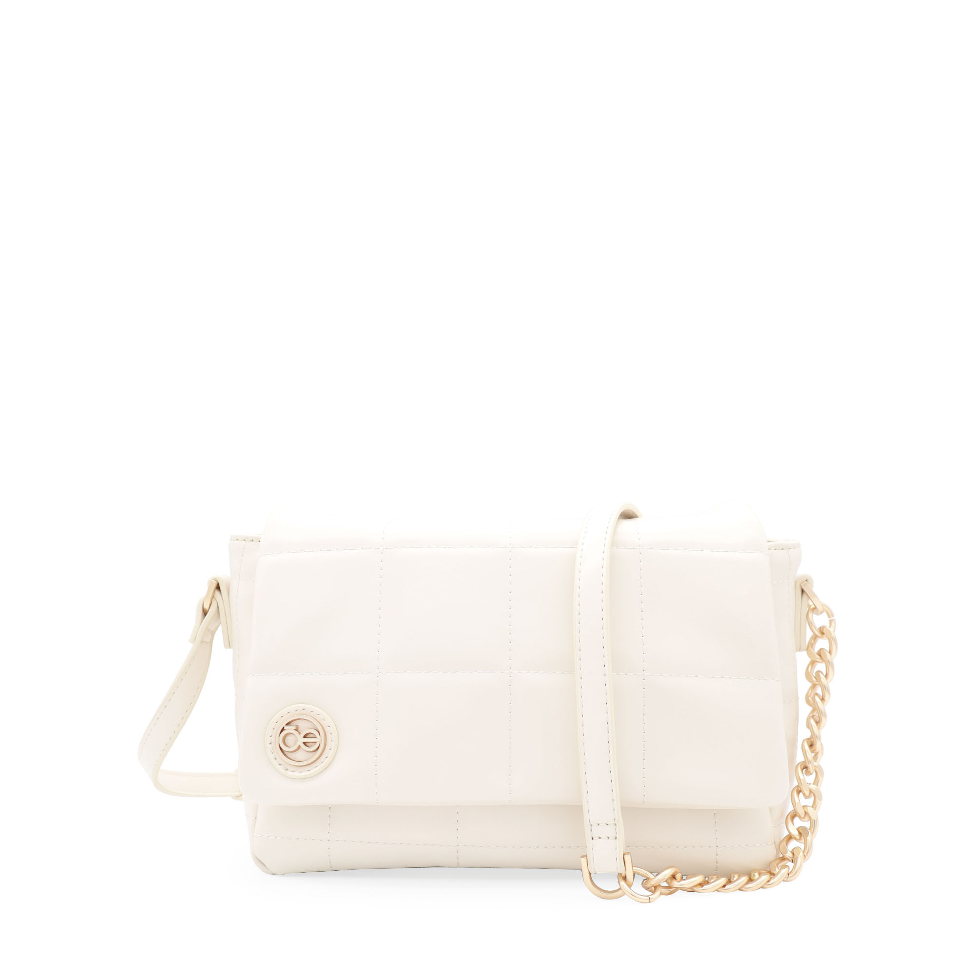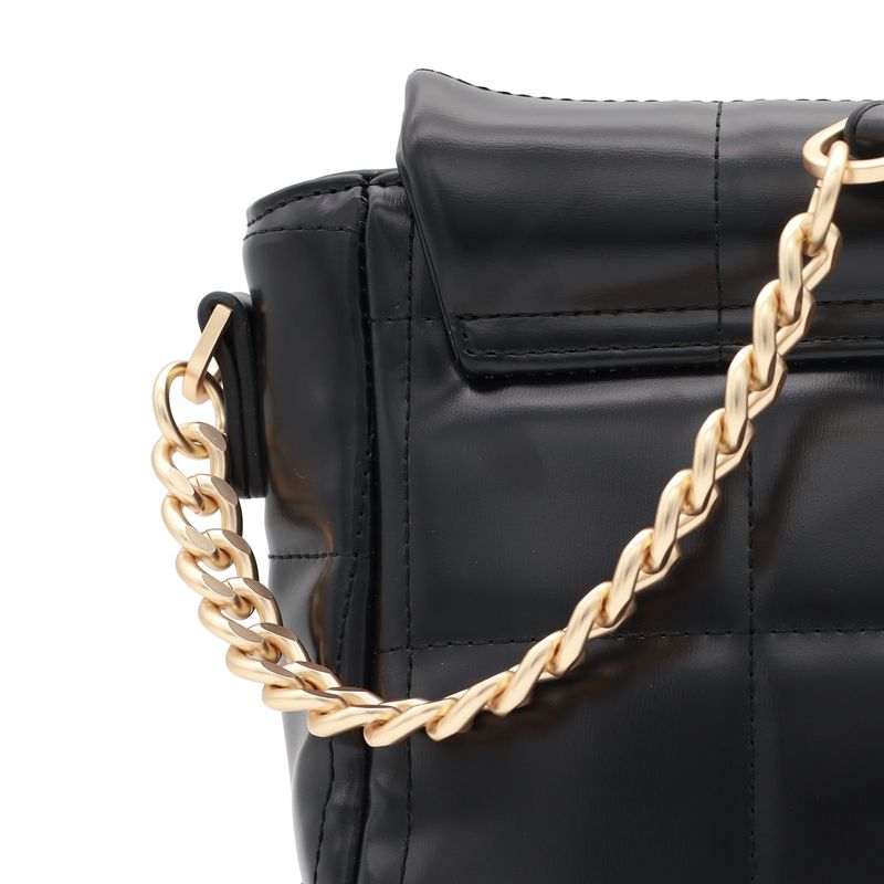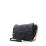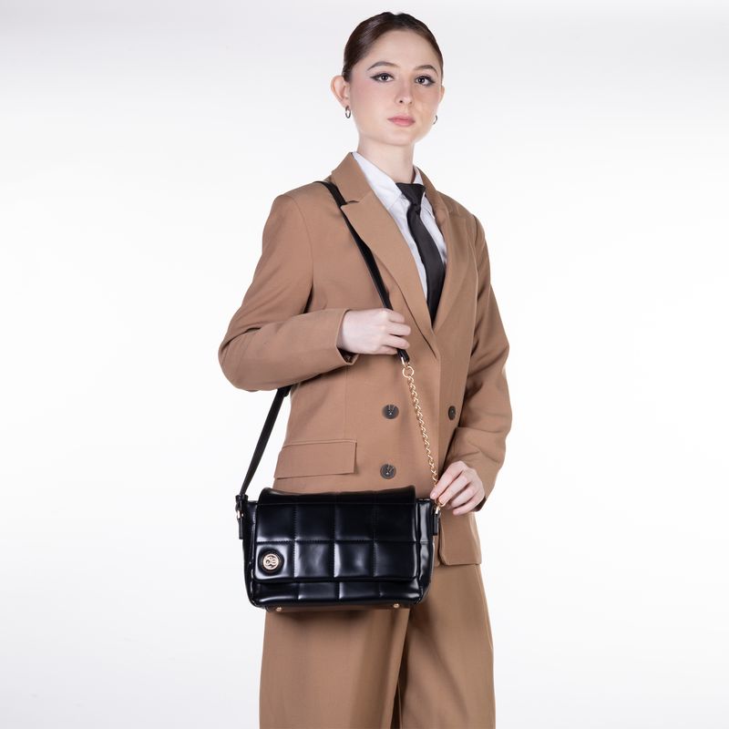 Bolso Crossbody hecho con material vegano apariencia piel. Cuenta con solapa con broches magnéticos. Diseño acolchado a cuadros. Herraje metálico de monograma. Asa larga con detalle de cadena.