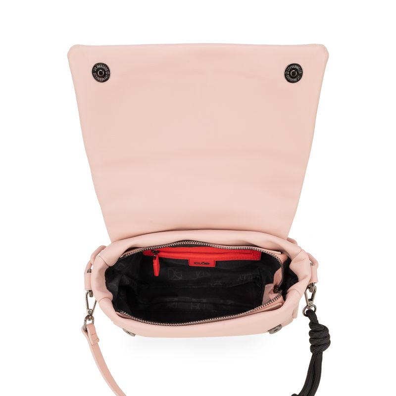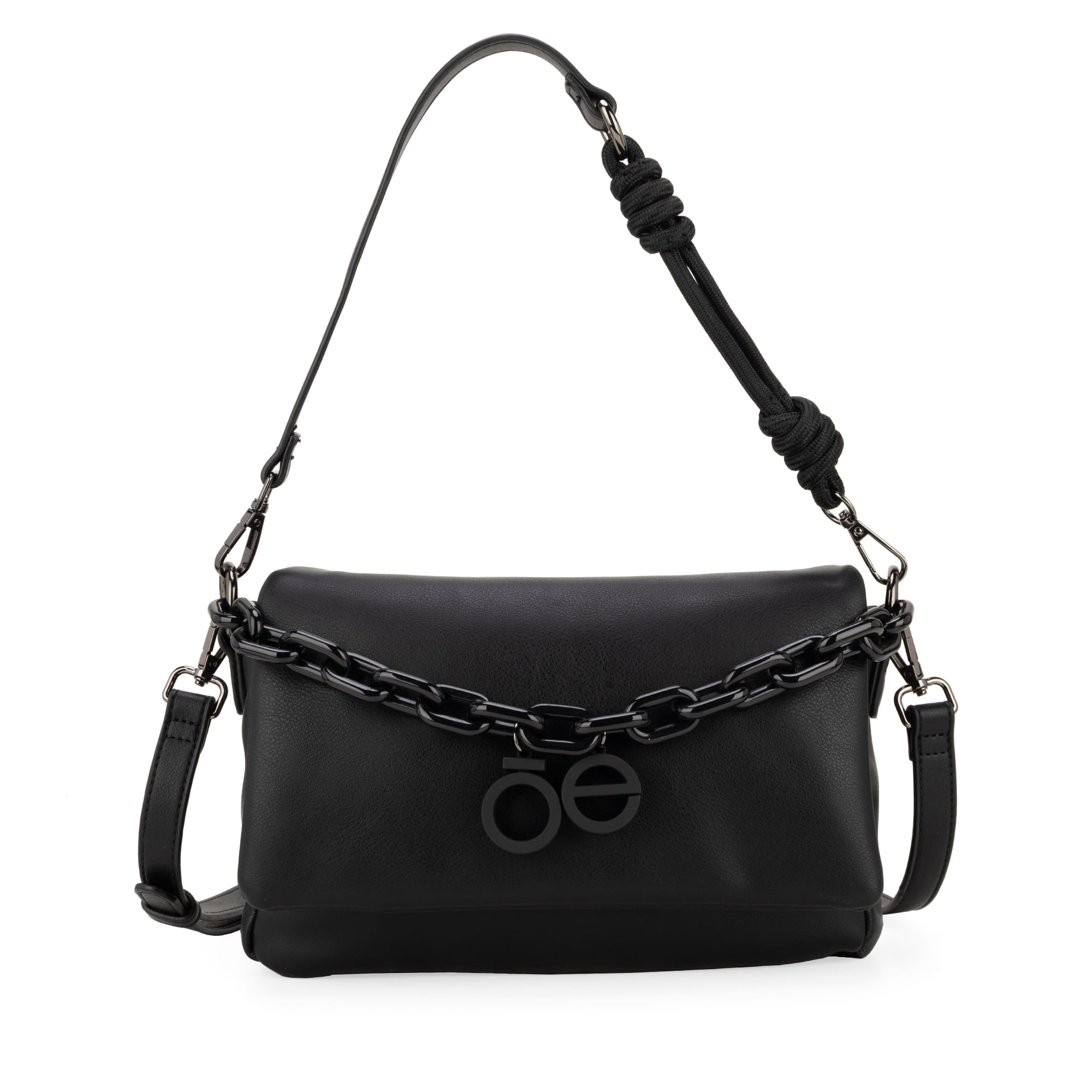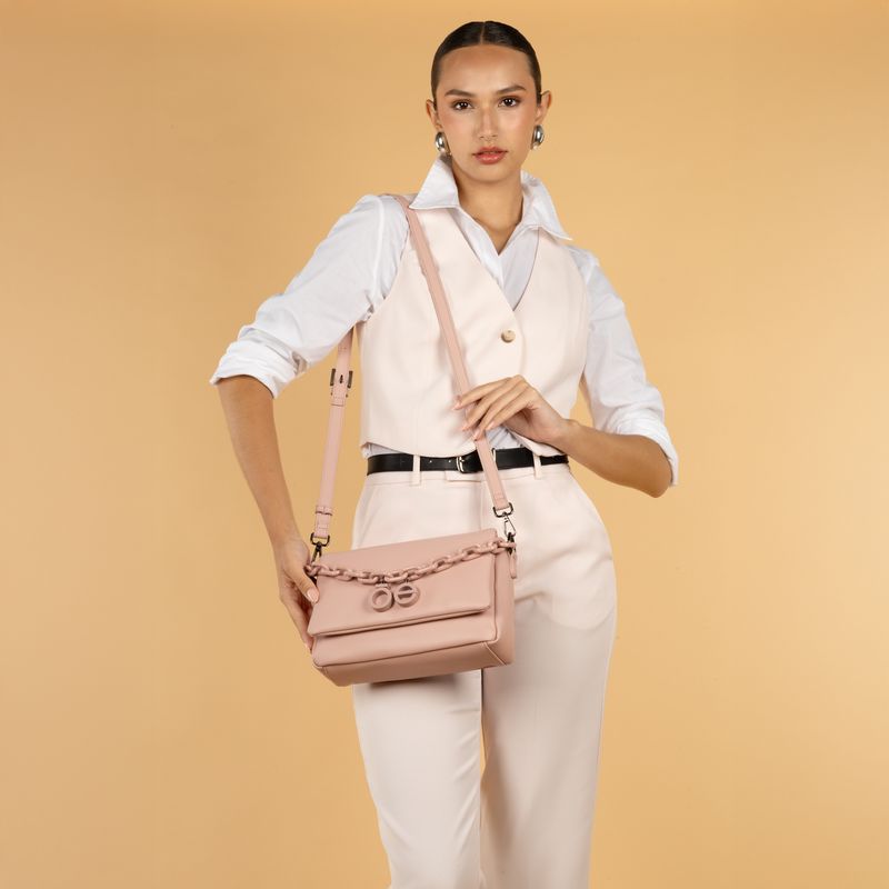 Bolso Crossbody hecho con material vegano apariencia piel. Cuenta con tapeta con broche imantado. Cadena acrílica decorativa. Charm de monograma. Cierre metálico de larga duración. Asa larga ajustable y removible