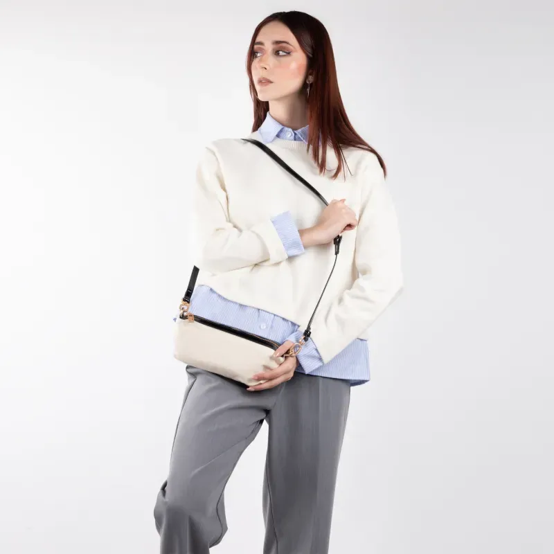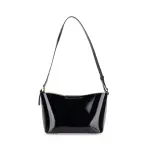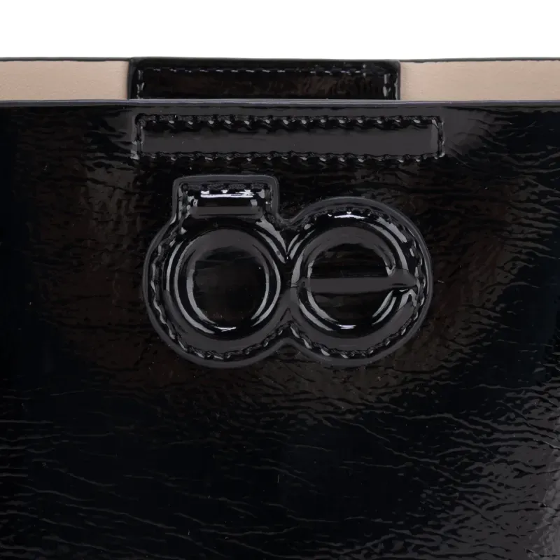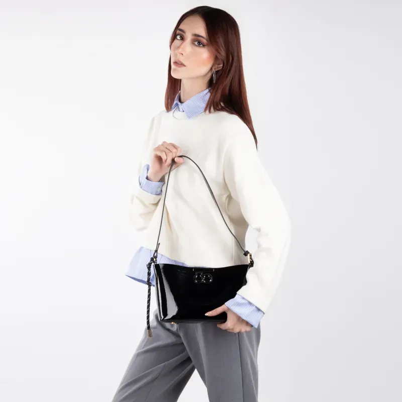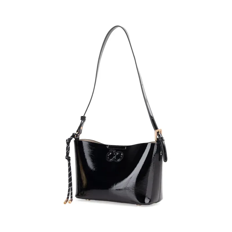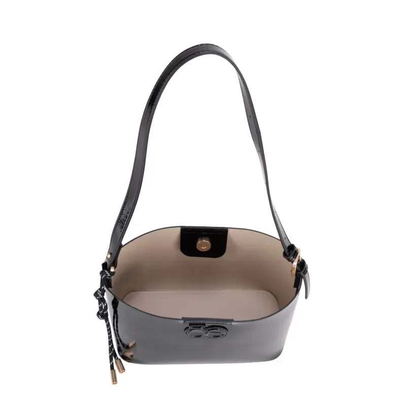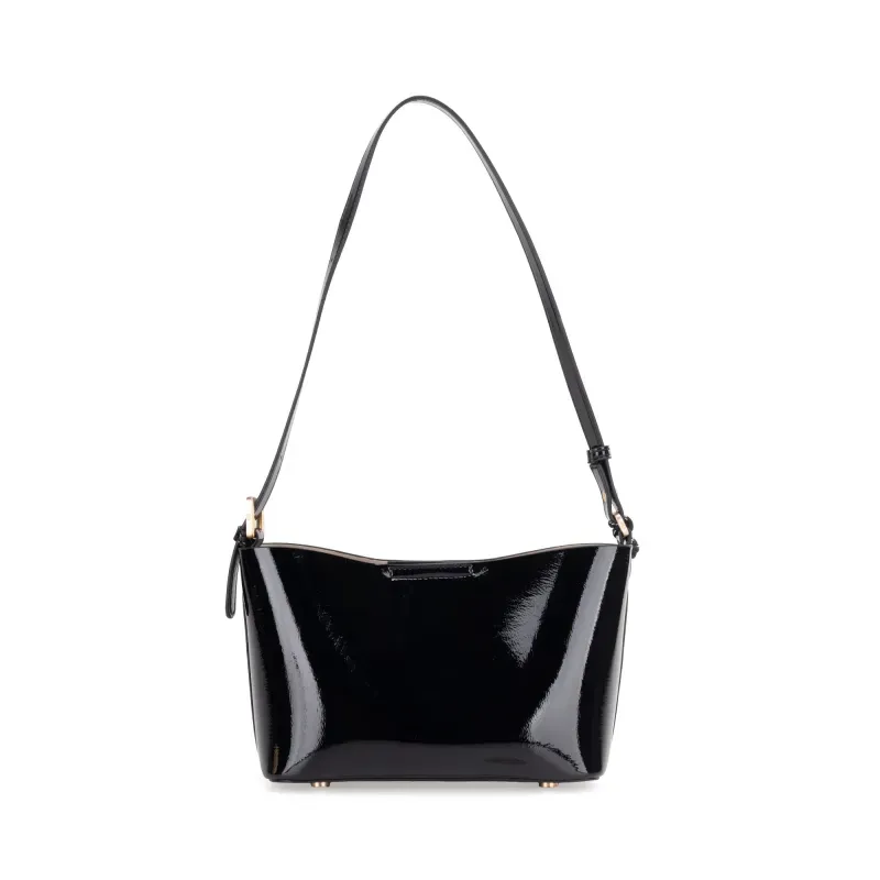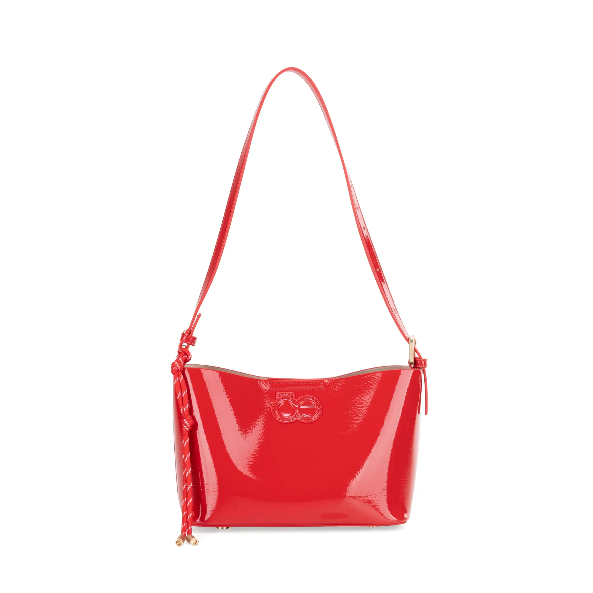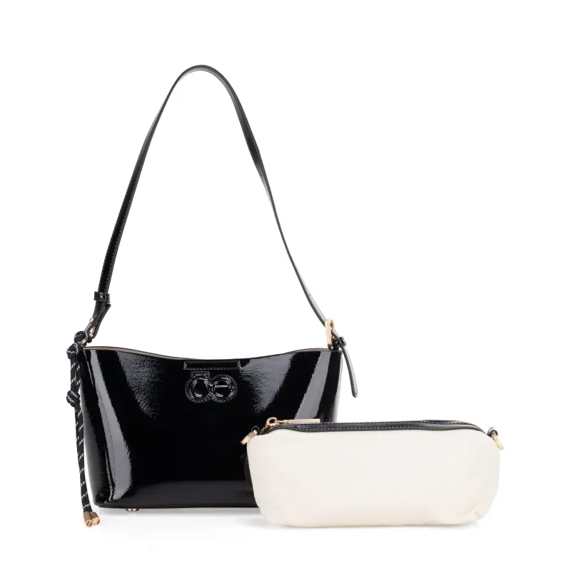 Bolso Crossbody hecho con material vegano acabado glossy. Cuenta con charm decorativo. Parche de monograma. Incluye pouch interno con asa larga para uso individual.