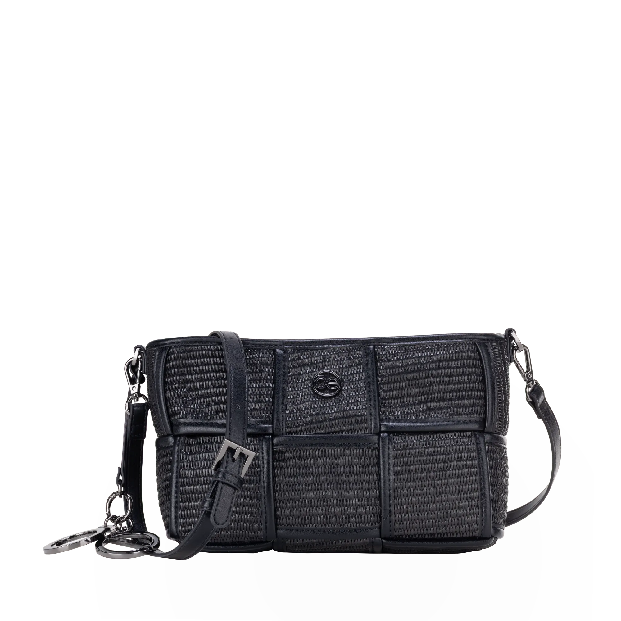 Bolso Crossbody hecho con material raffia. Cuenta con cierre metálico de larga duración. Asa larga ajustable y desprendible. Incluye charm de monograma metálico.
