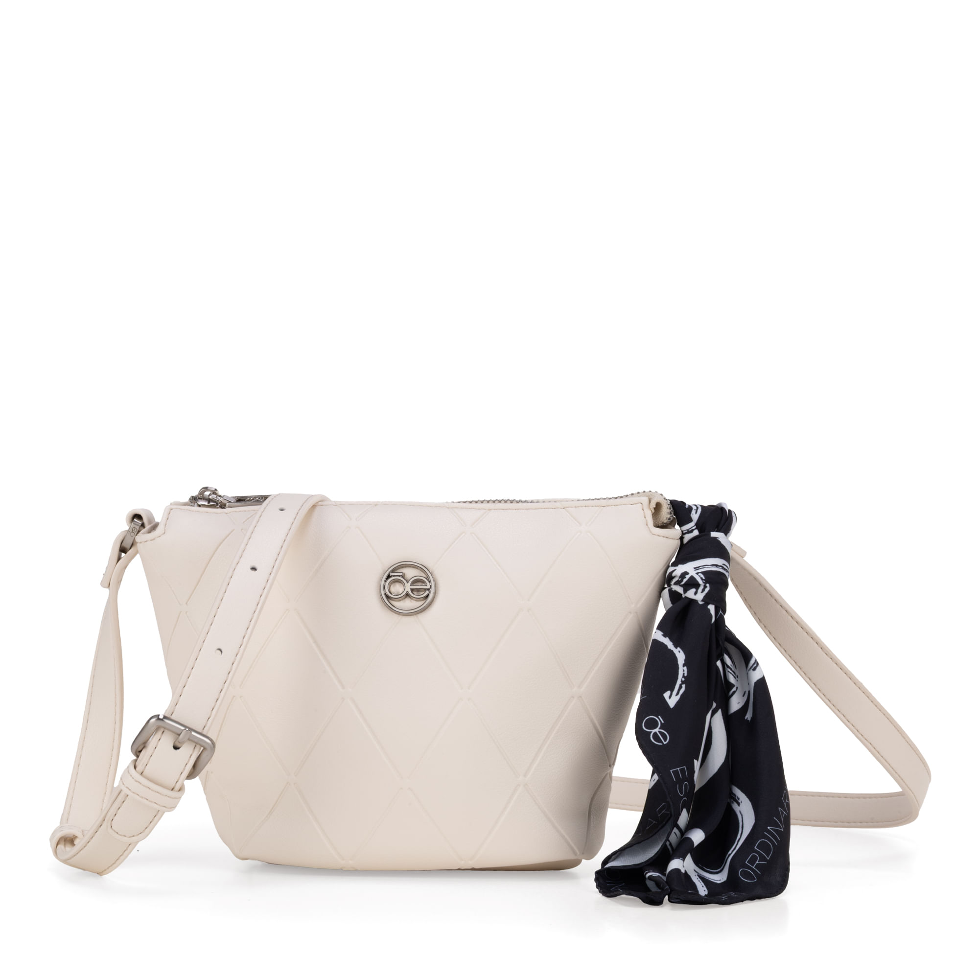 Bolso Crossbody hecho con material vegano apariencia piel. Cuenta con cierre metálico de larga duración. Diseño de troquelado a rombos. Herraje metálico de monograma. Incluye mascada multiusos desprendible. Asa larga ajustable.