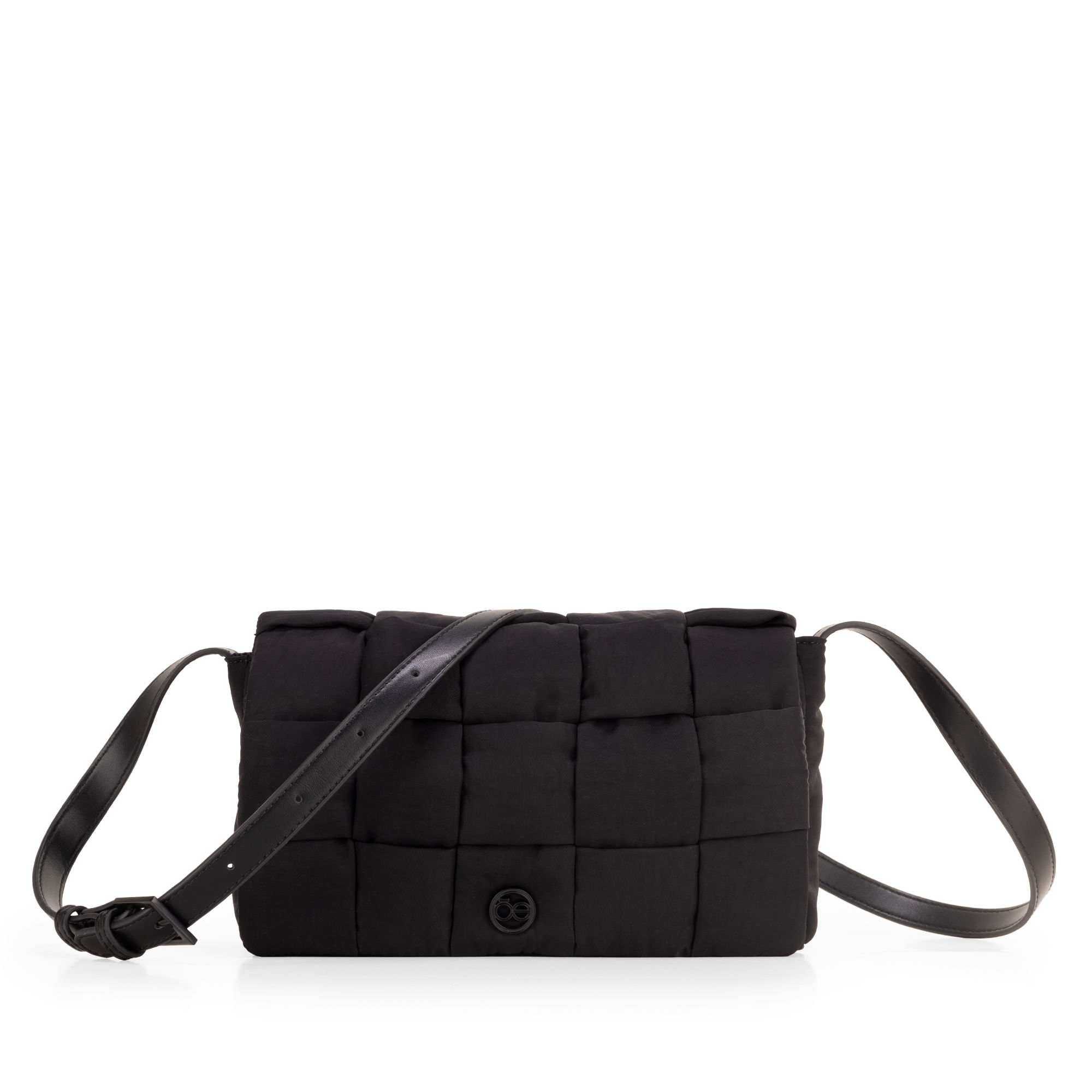 Bolso hecho con material textil resistente. Cuenta con tapeta con broche magnético. Look tejido acolchado. Herraje de monograma esmaltado al tono. Compartimento posterior con cierre. Asa larga ajustable.