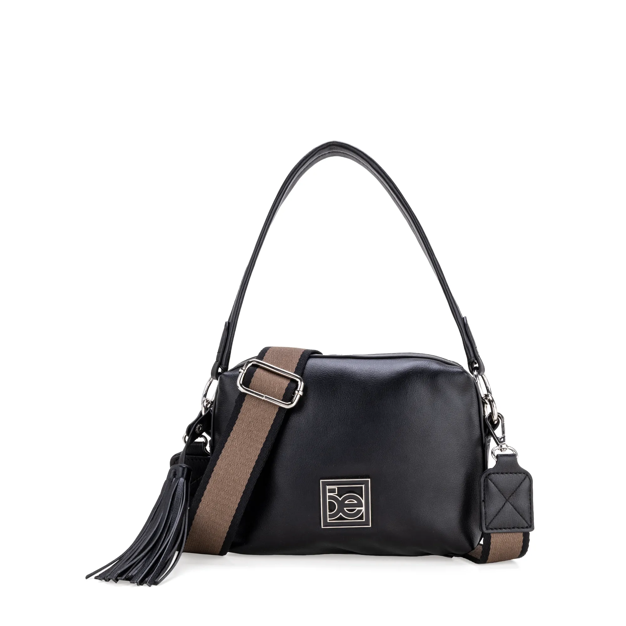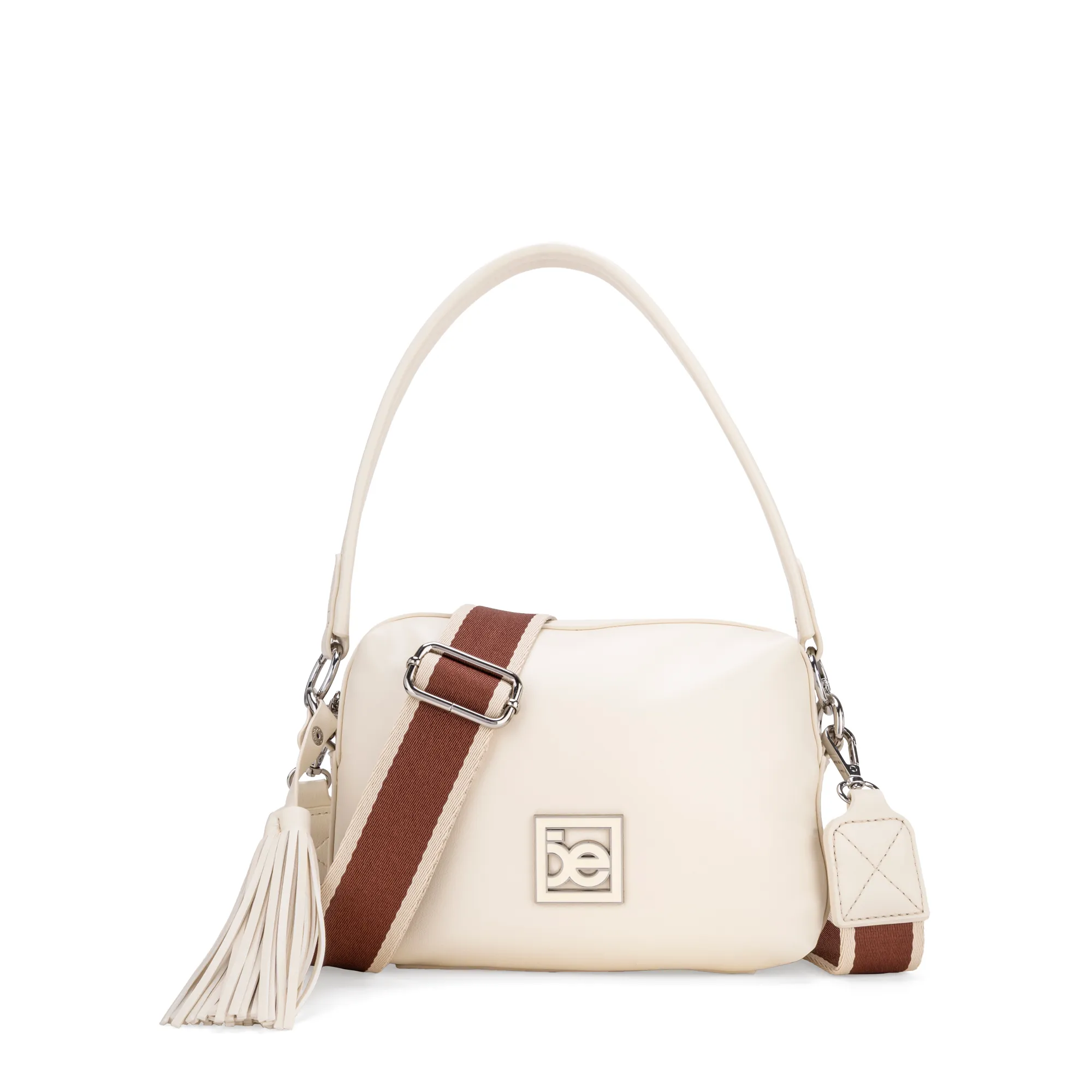 Bolso crossbody hecho con material vegano. Cuenta con tassel decorativo desprendible. Asa larga ajustable y desprendible. Asa corta desprendible. Tiene herraje metálico esmaltado de monograma. Cierre metálico de larga duración