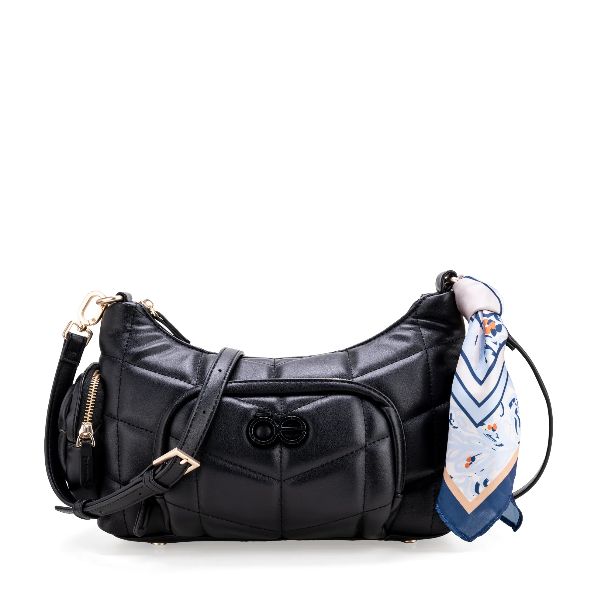 Bolso Crossbody hecho con material vegano. Cuenta con múltiples compartimentos externos con cierre metálico de larga duración. Asa larga ajsutable y desprendible. Incluye mascada multiusos desprendible. Herraje metálico de monograma. Cierre metálico de larga duración