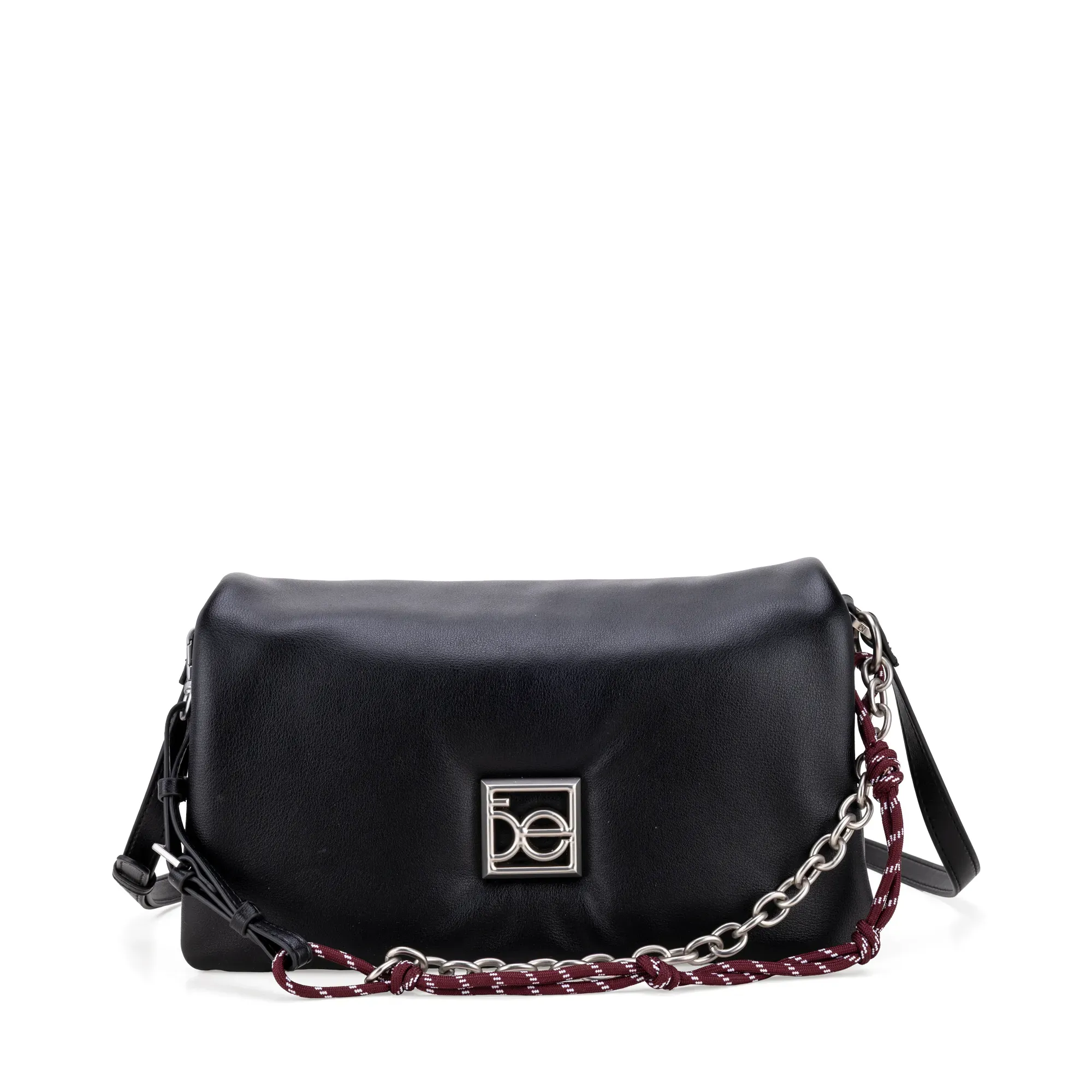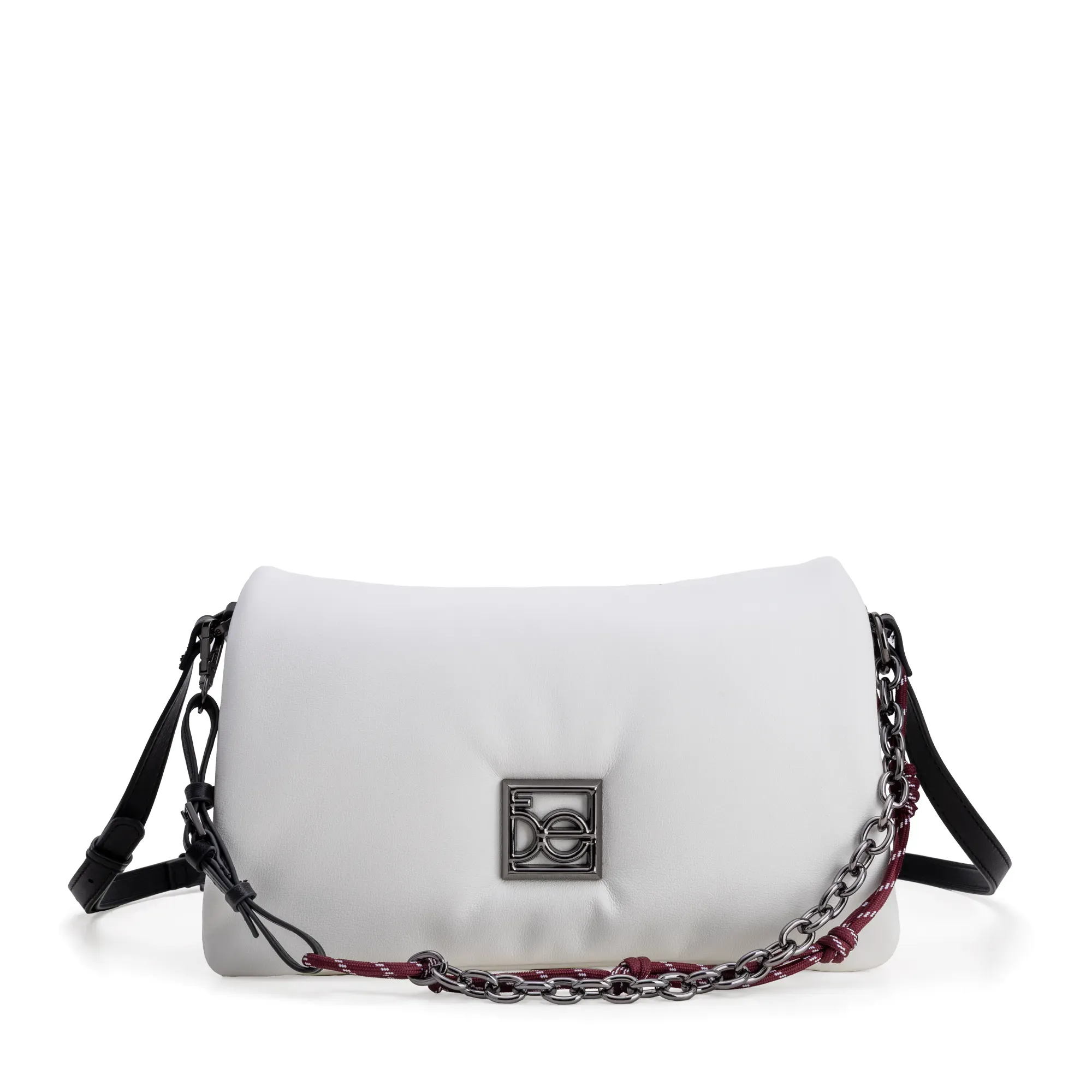 Bolso Crossbody hecho con material vegano. Cuenta con asa larga ajsutable. Asa larga de cadena desprendible. Tiene herraje metálico de monograma.