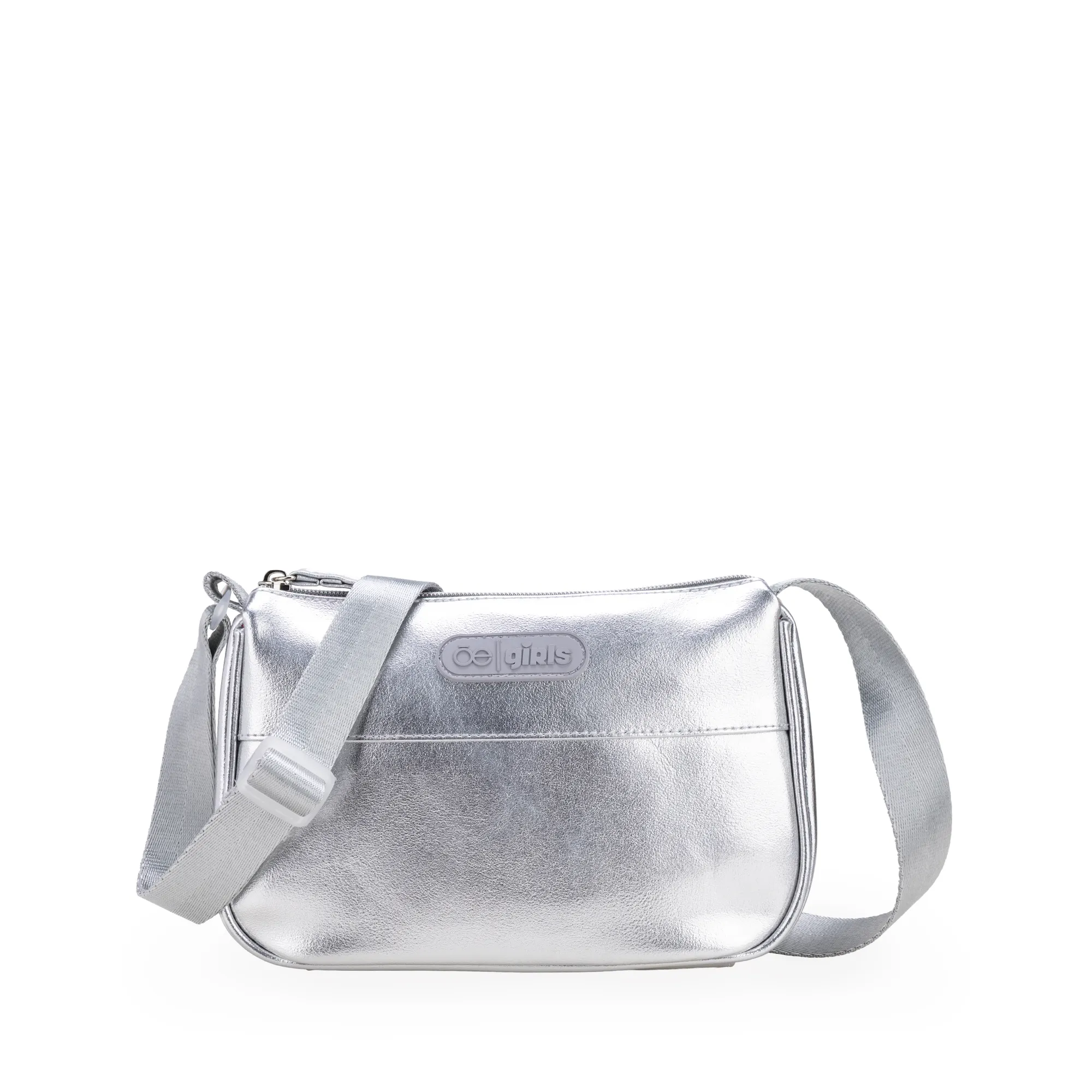 Bolso Crossbody hecho con material vegano. Cuenta con cierre de larga duración. Asa larga ajustable. Tiene acabado metálico.