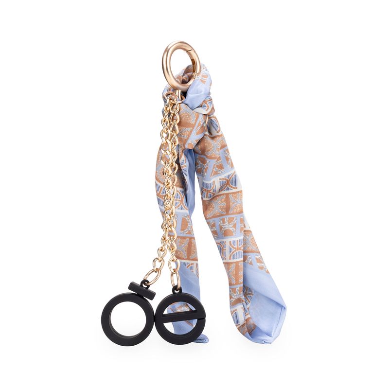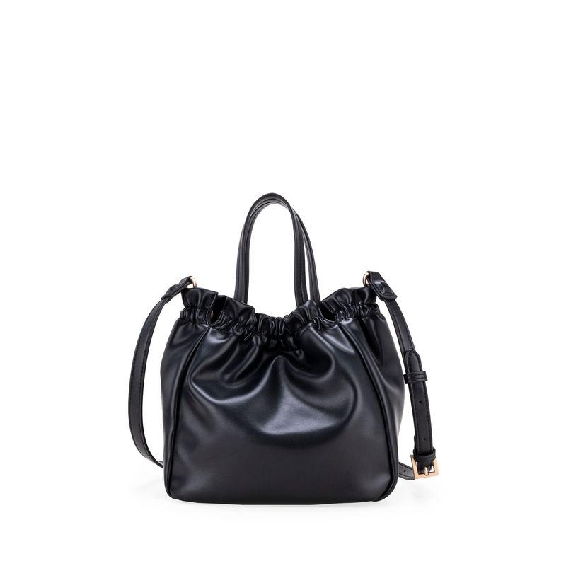 Bolso Drawstring hecho con material vegano apariencia piel. Cuenta con diseño de pliegues en la parte superior del bolso. Asas de hombro reforzadas. Incluye charm de monograma con mascada multiusos desprendible. Asa larga ajustable y removible.