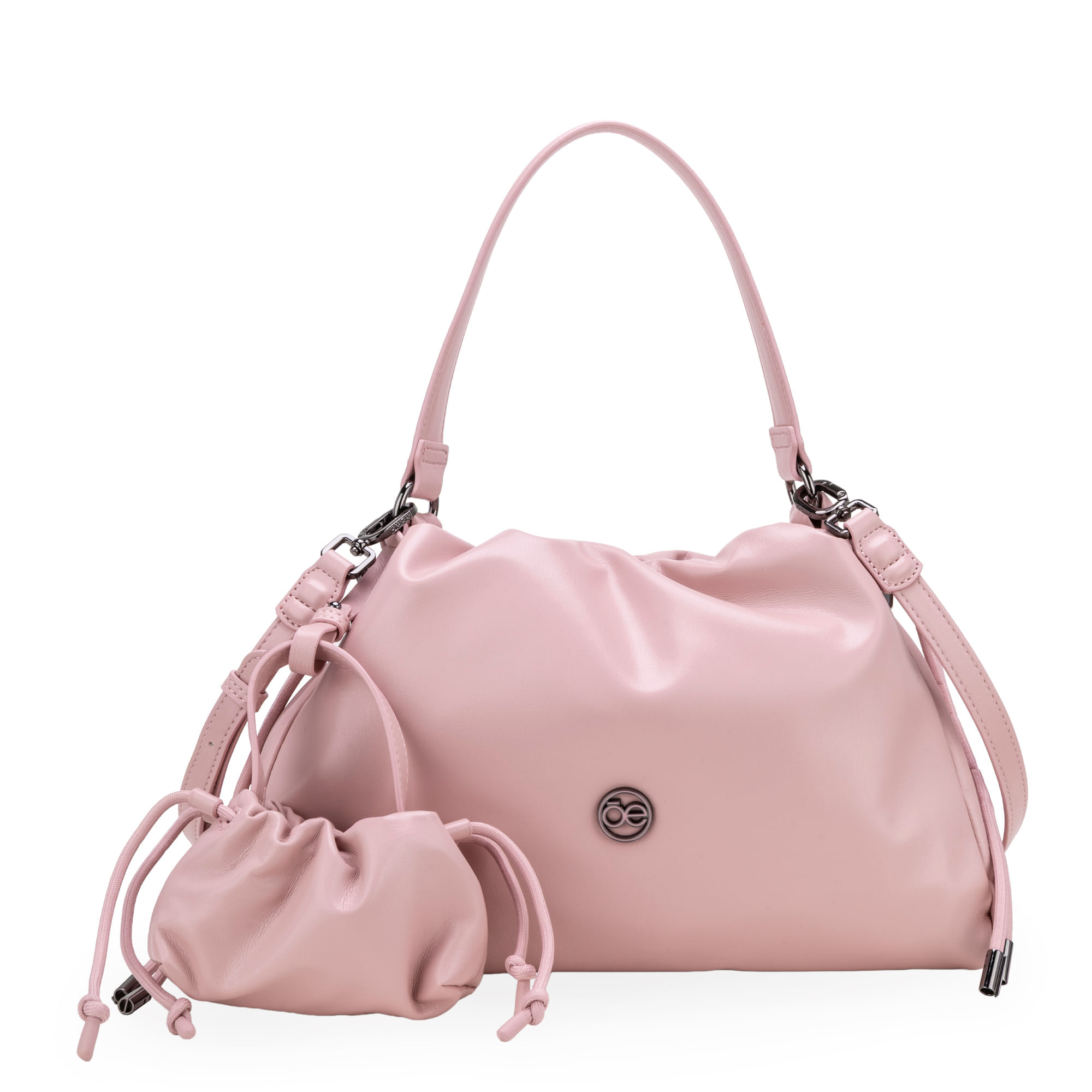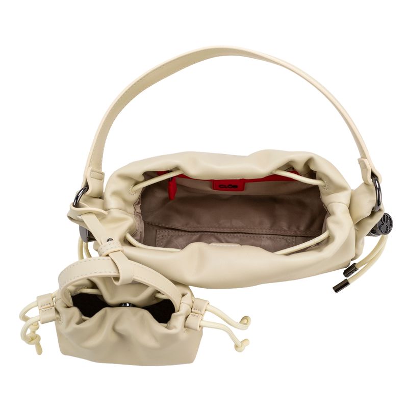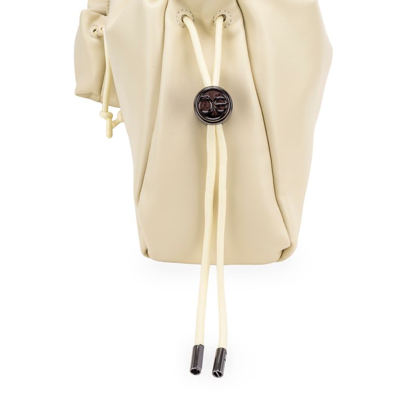 Bolso Drawstring hecho con material vegano apariencia piel. Cuenta con charm mini bolso. Herraje metálico de monograma. Asa larga ajustable y removible.