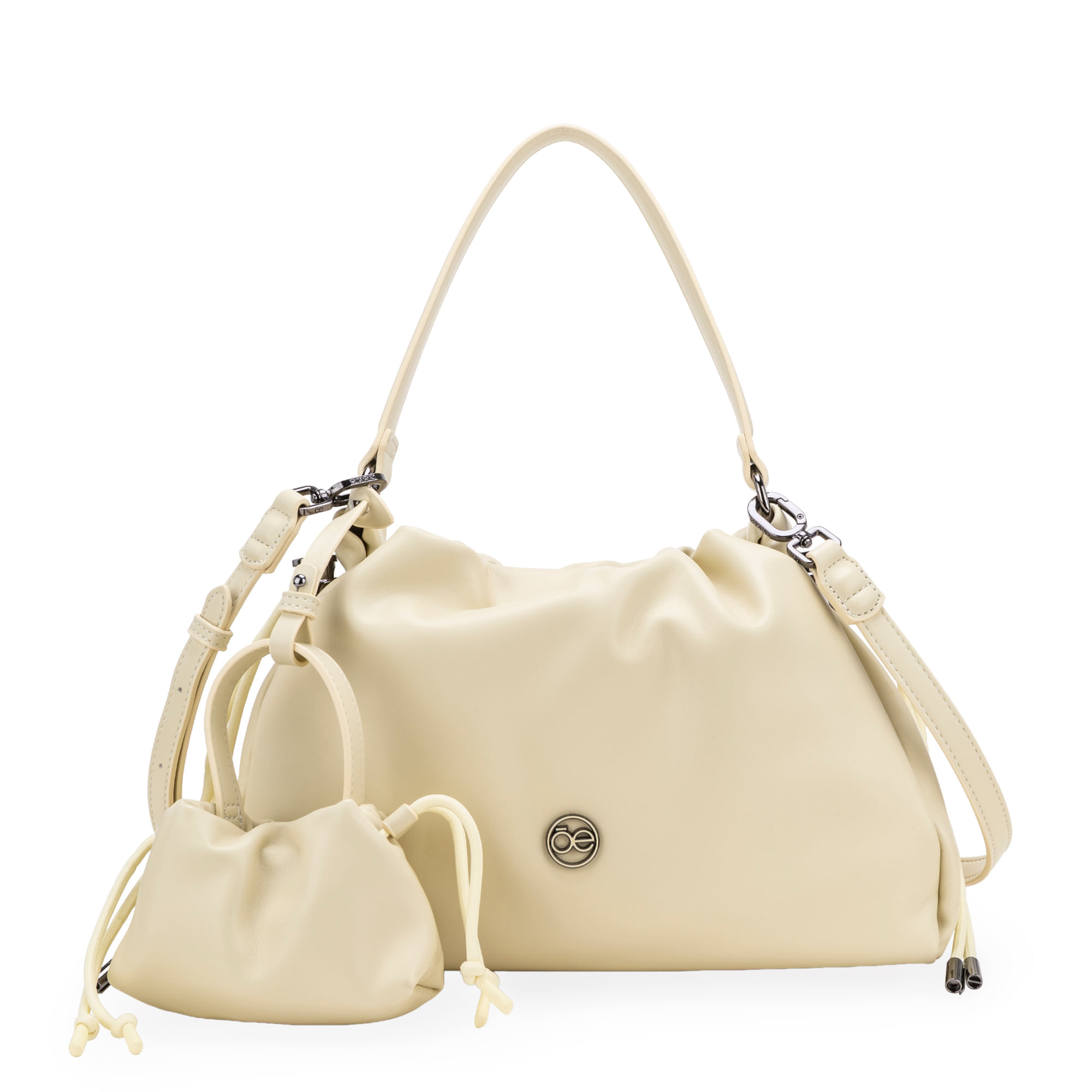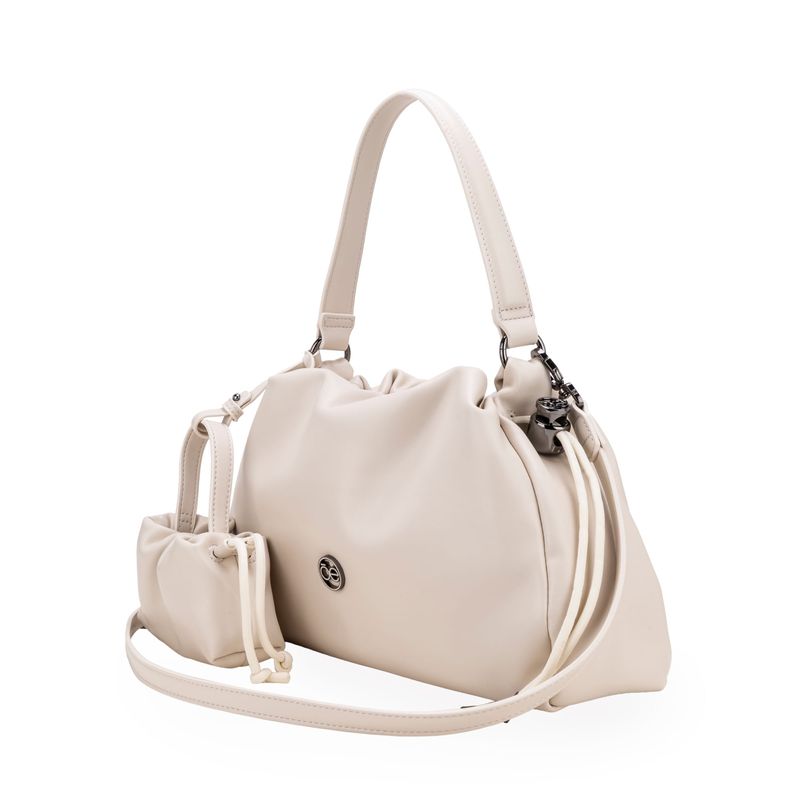 Bolso Drawstring hecho con material vegano apariencia piel. Cuenta con charm mini bolso. Herraje metálico de monograma. Asa larga ajustable y removible.