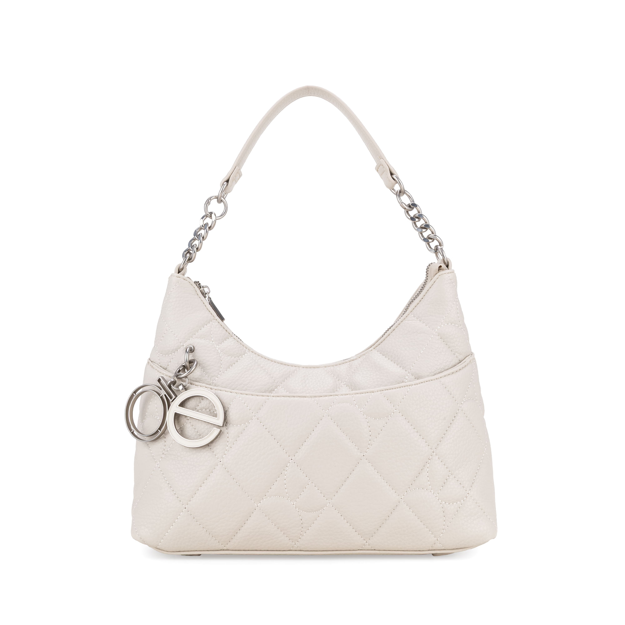Bolso Hobo hecho con material vegano apariencia piel. Cuenta con diseño de rombos bordados. Tiene cierre metálico de larga duración. Incluye charm decorativo desprendible.