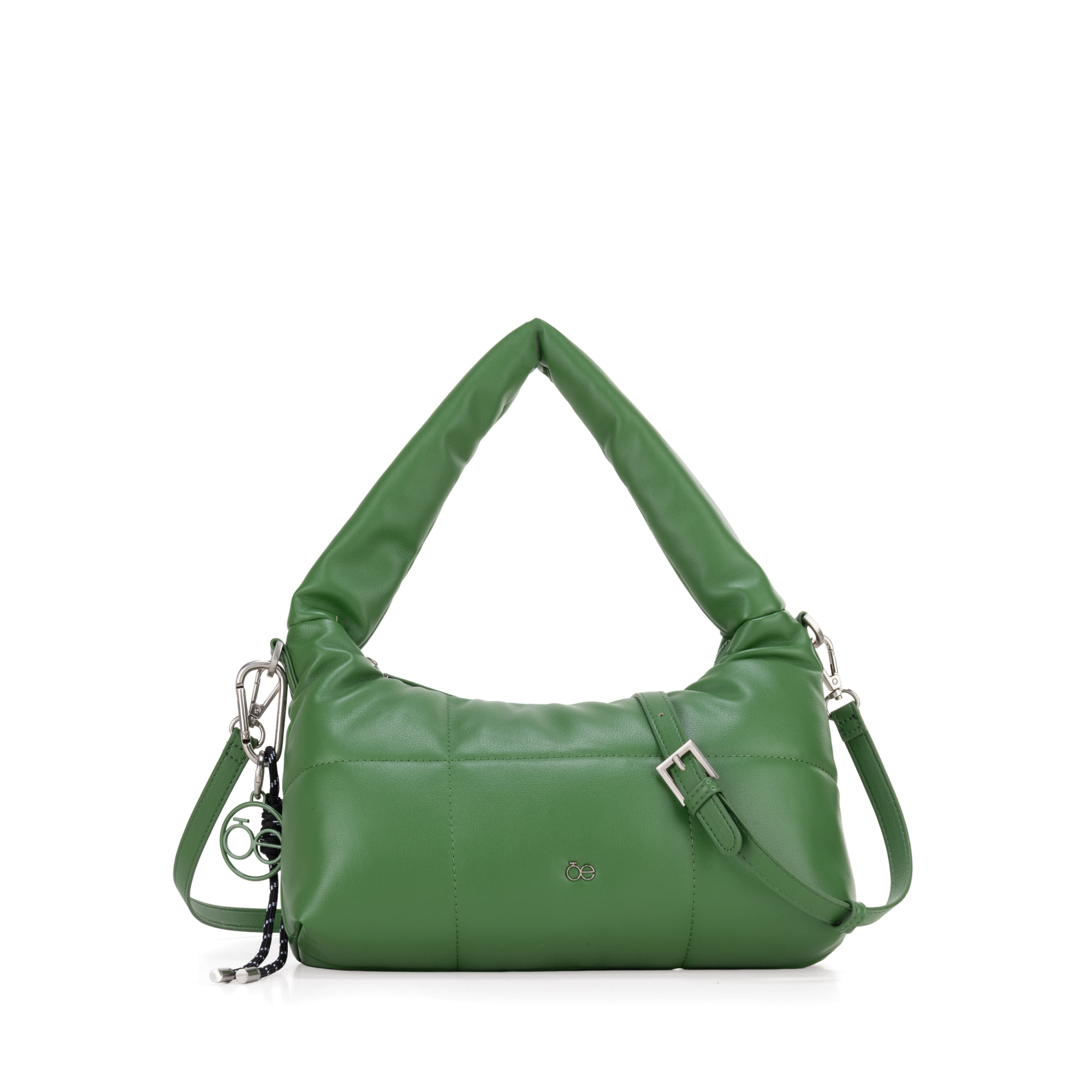 Bolso Hobo hecho con material vegano apariencia piel diseño acolchado. Cuenta con cierre metálico de larga duración. Tiene suave asa de hombro acolchada. Charm decorativo desprendible. Asa larga ajustable y removible.