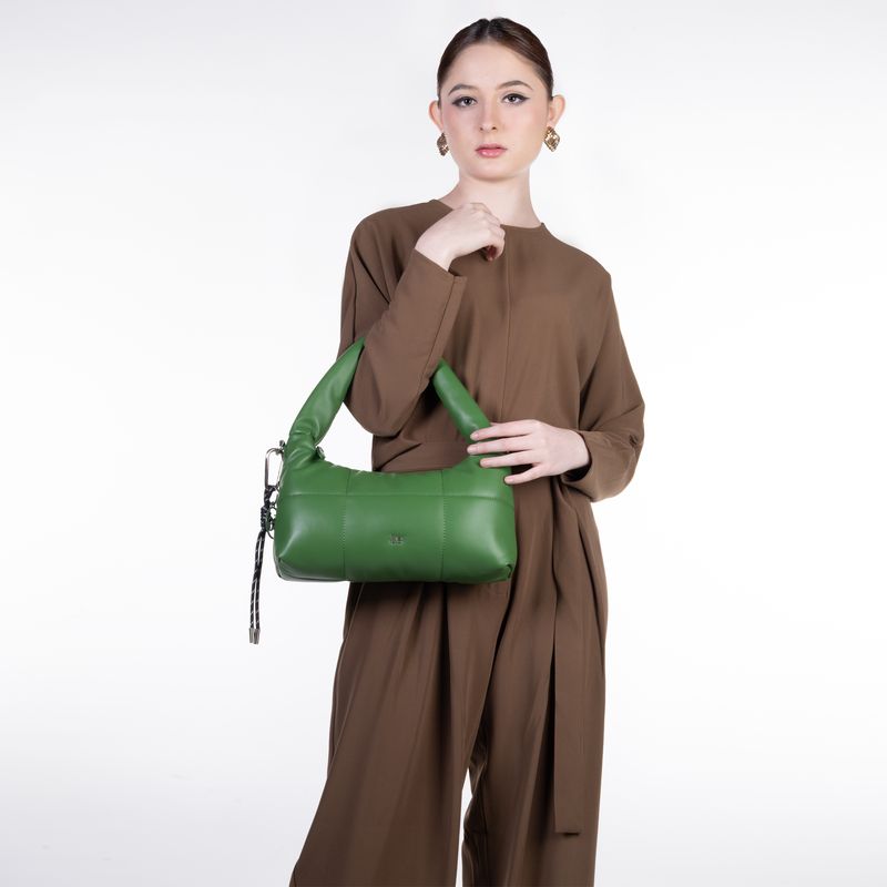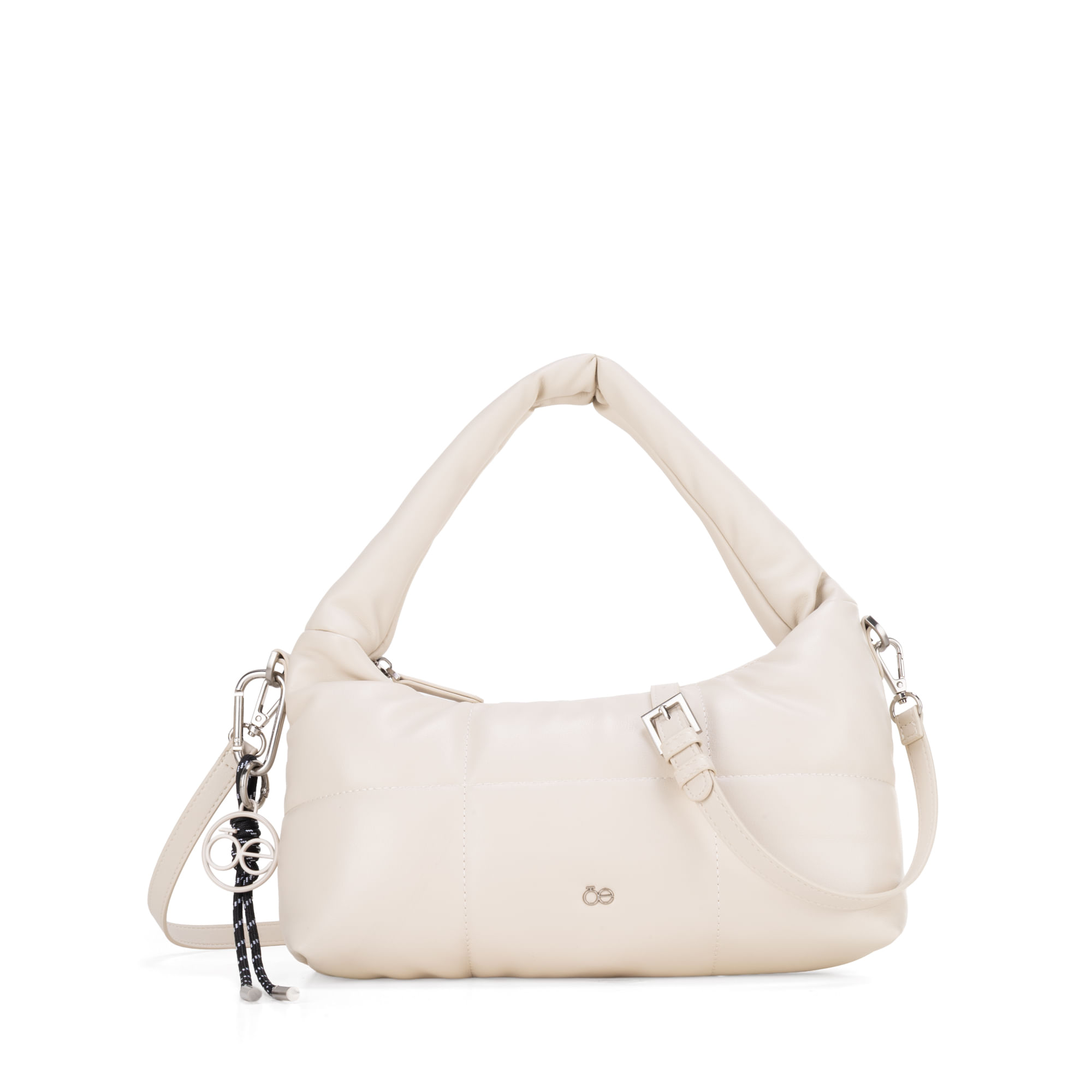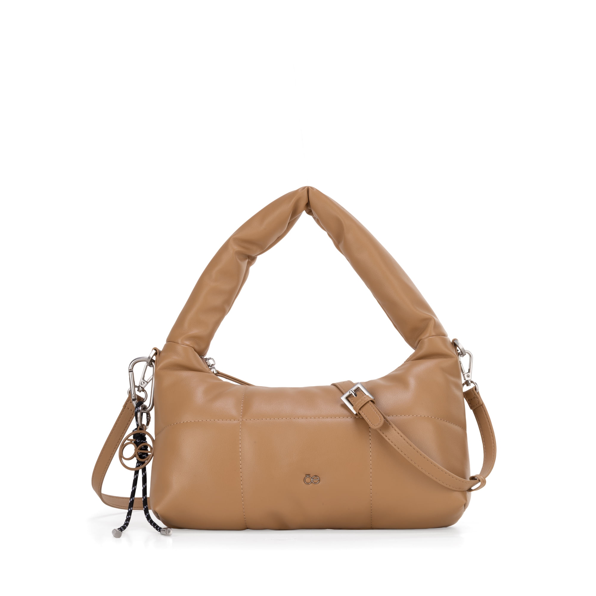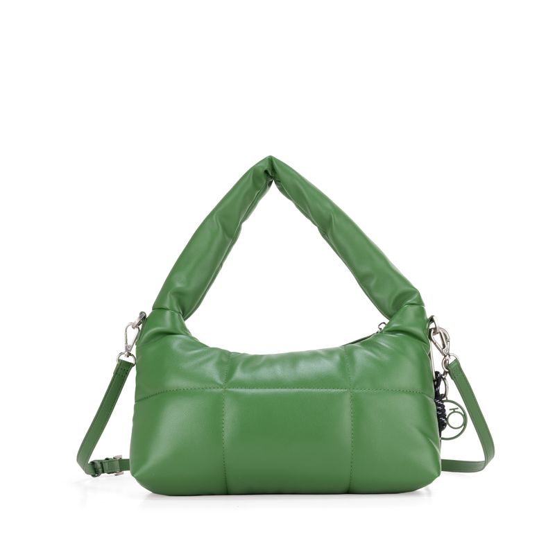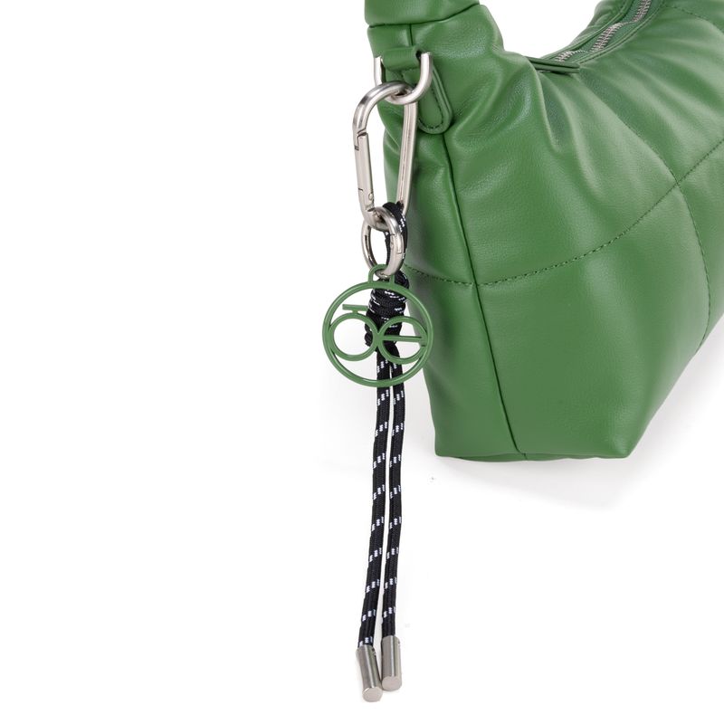 Bolso Hobo hecho con material vegano apariencia piel diseño acolchado. Cuenta con cierre metálico de larga duración. Tiene suave asa de hombro acolchada. Charm decorativo desprendible. Asa larga ajustable y removible.