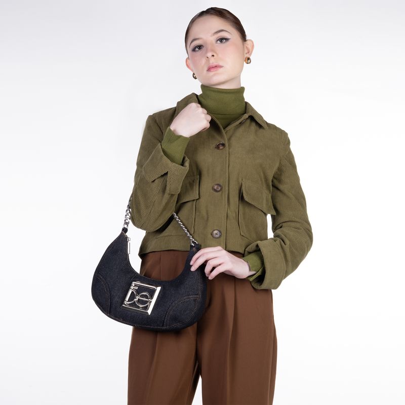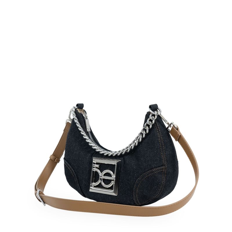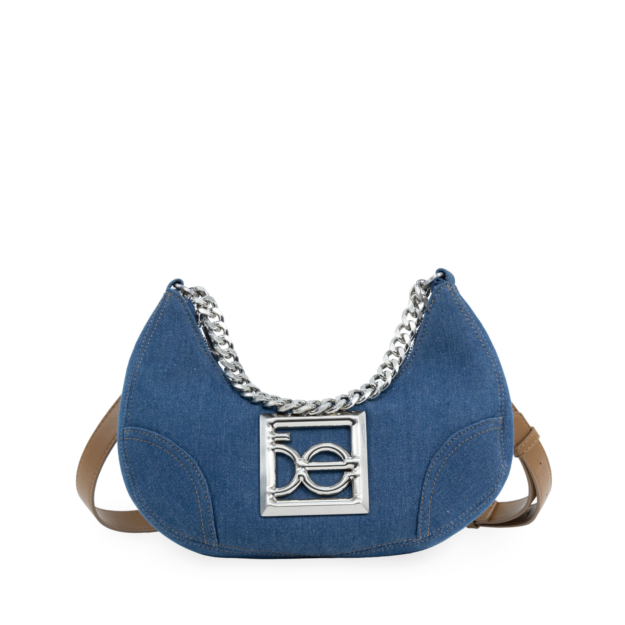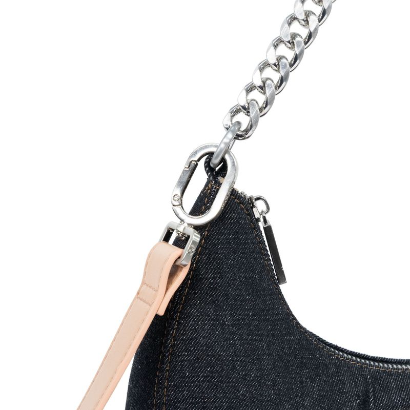 Bolso Hobo hecho con material denim. Cuenta con cierre metálico de larga duración. Tiene asa de mano de cadena chunky. Herraje metálico de monograma. Asa larga ajustable y removible.