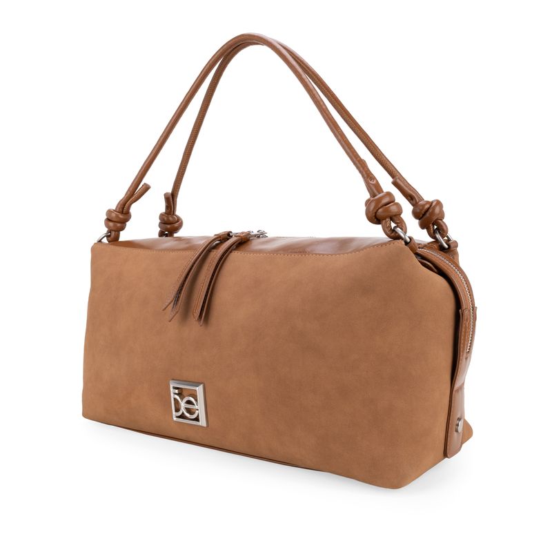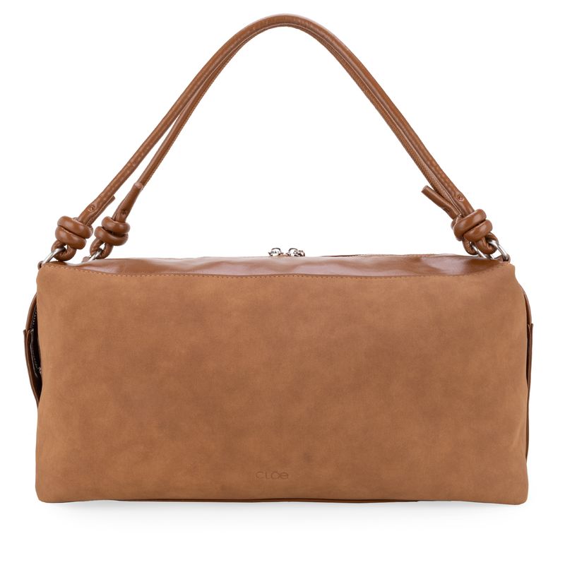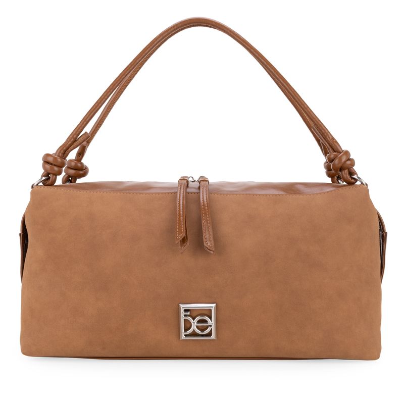 Bolso Hobo hecho con material vegano apariencia piel. Cuenta con cierre metálico de larga duración. Tiene herraje de monograma. Asas de hombro con detalles de nudos en laterales.
