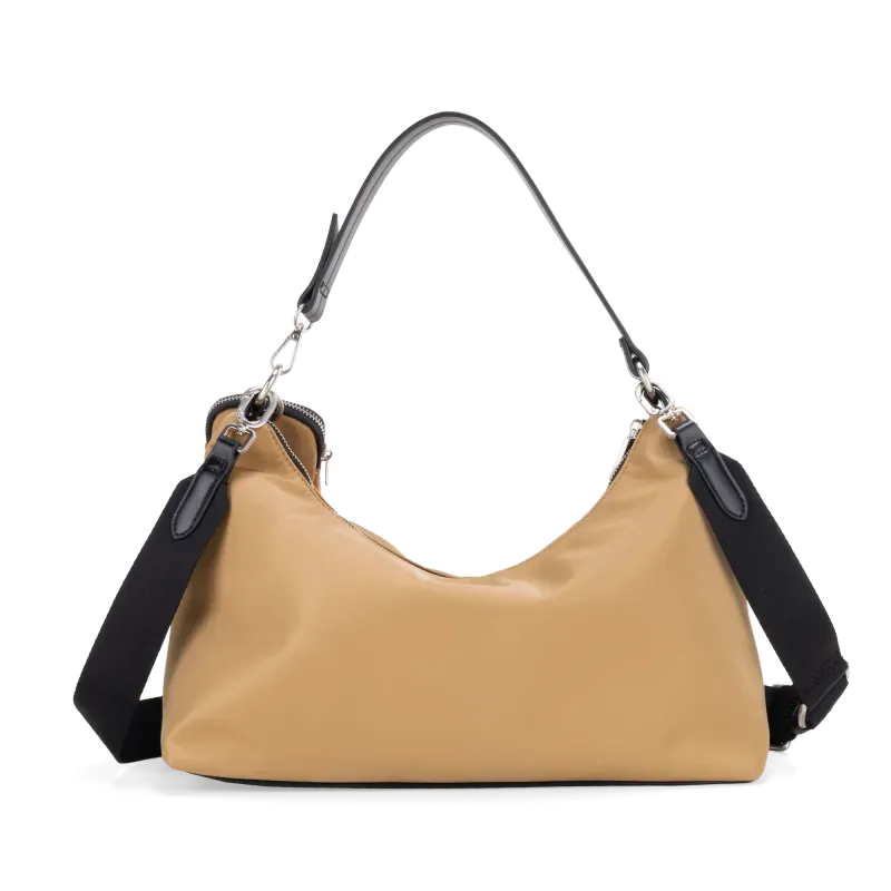 Bolso Drawstring hecho con material textil. Cuenta con asa larga ajustable y desprendible. Asa corta. Incluye monedero desprendible. Rubber de monograma.