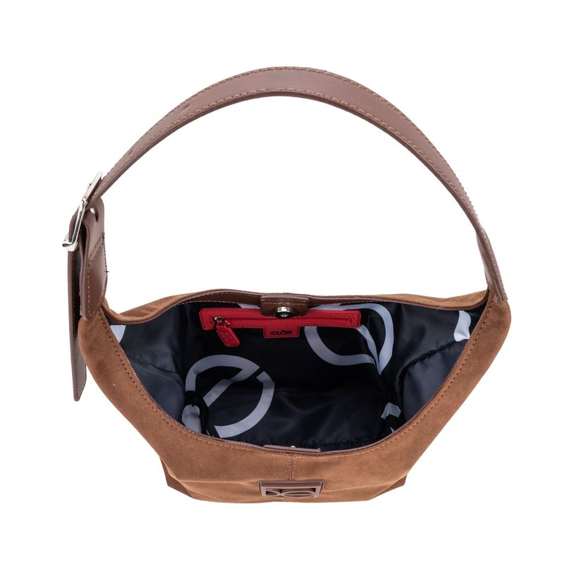 Bolso hecho con material textil. Cuenta con asa al hombro ajsutable con hebilla. Rubber de monograma. Tiene broche magnético.
