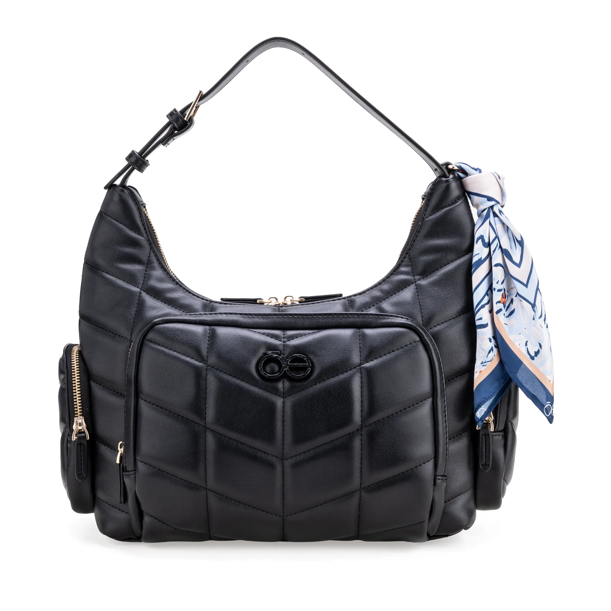 Bolso Crossbody hecho con material vegano. Cuenta con múltiples compartimentos externos con cierre metálico de larga duración. Asa al hombro ajustable. Incluye mascada multiusos desprendible. Herraje metálico de monograma. Cierre metálico de larga duración