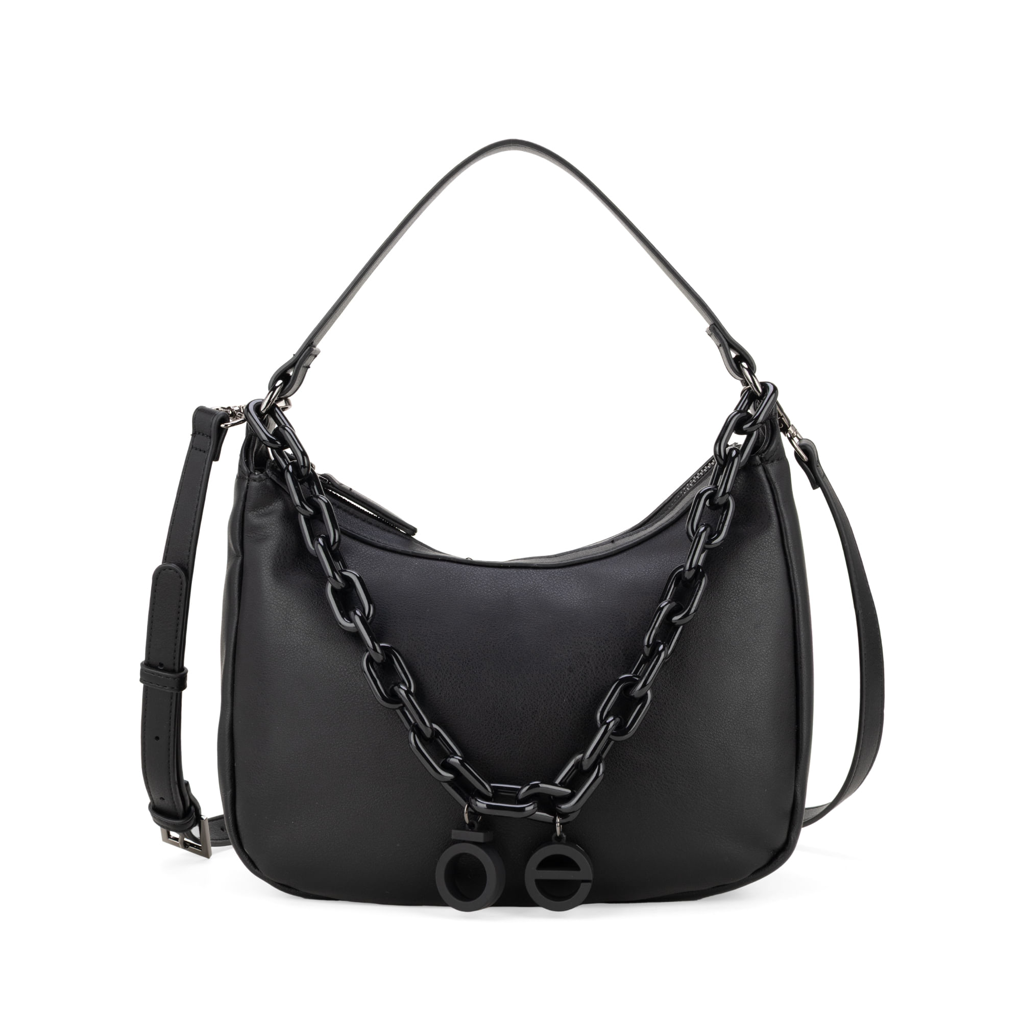 Bolso Hobo hecho con material vegano apariencia piel. Cuenta con cierre metálico de larga duración. Cadena acrílica decorativa. Charm de monograma. Asa larga ajustable y removible