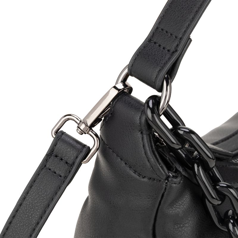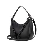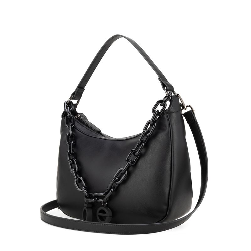 Bolso Hobo hecho con material vegano apariencia piel. Cuenta con cierre metálico de larga duración. Cadena acrílica decorativa. Charm de monograma. Asa larga ajustable y removible
