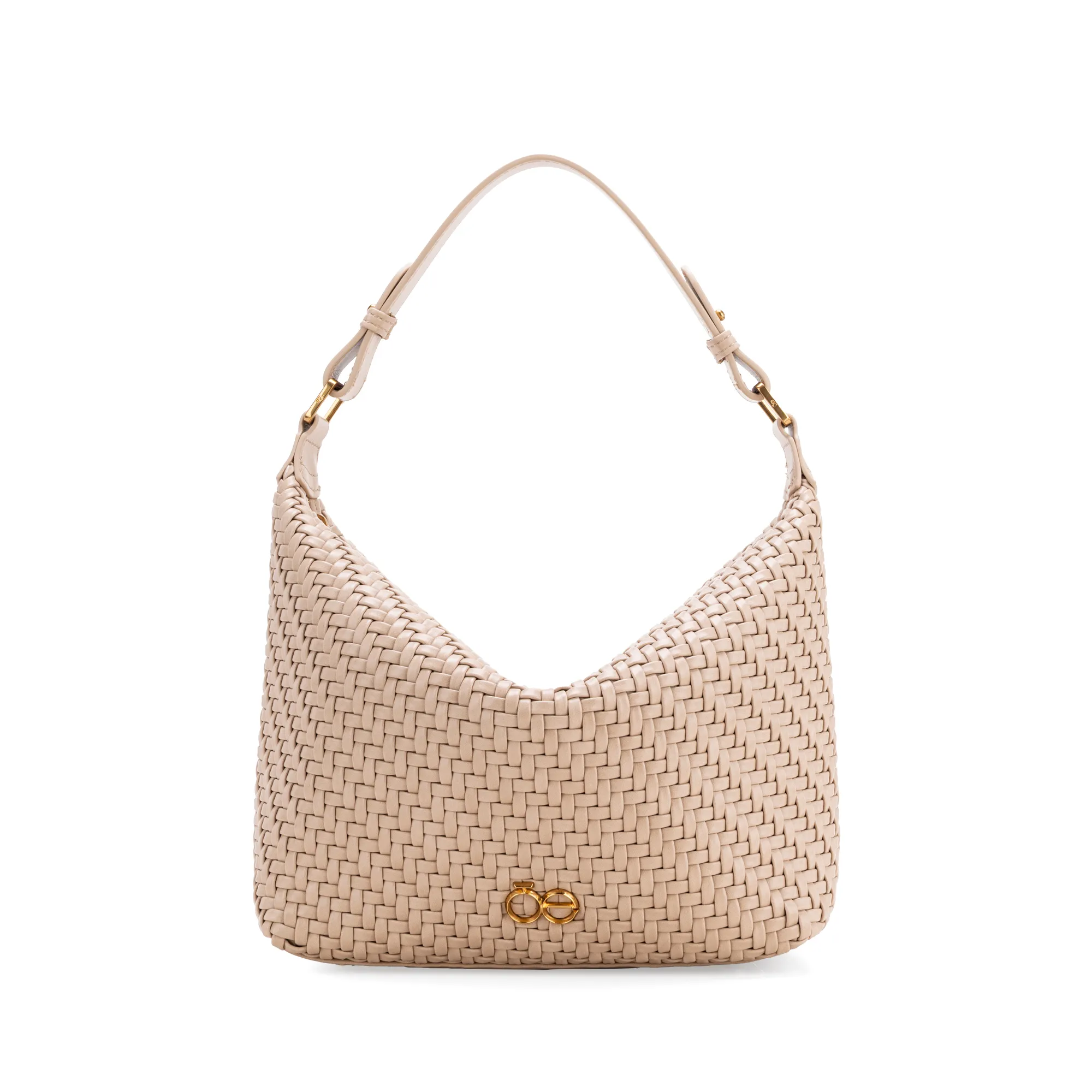 Bolso Hobo hecho con material vegano. Cuenta con cierre metálico. Herraje de monograma. Incluye asas intercambiables.