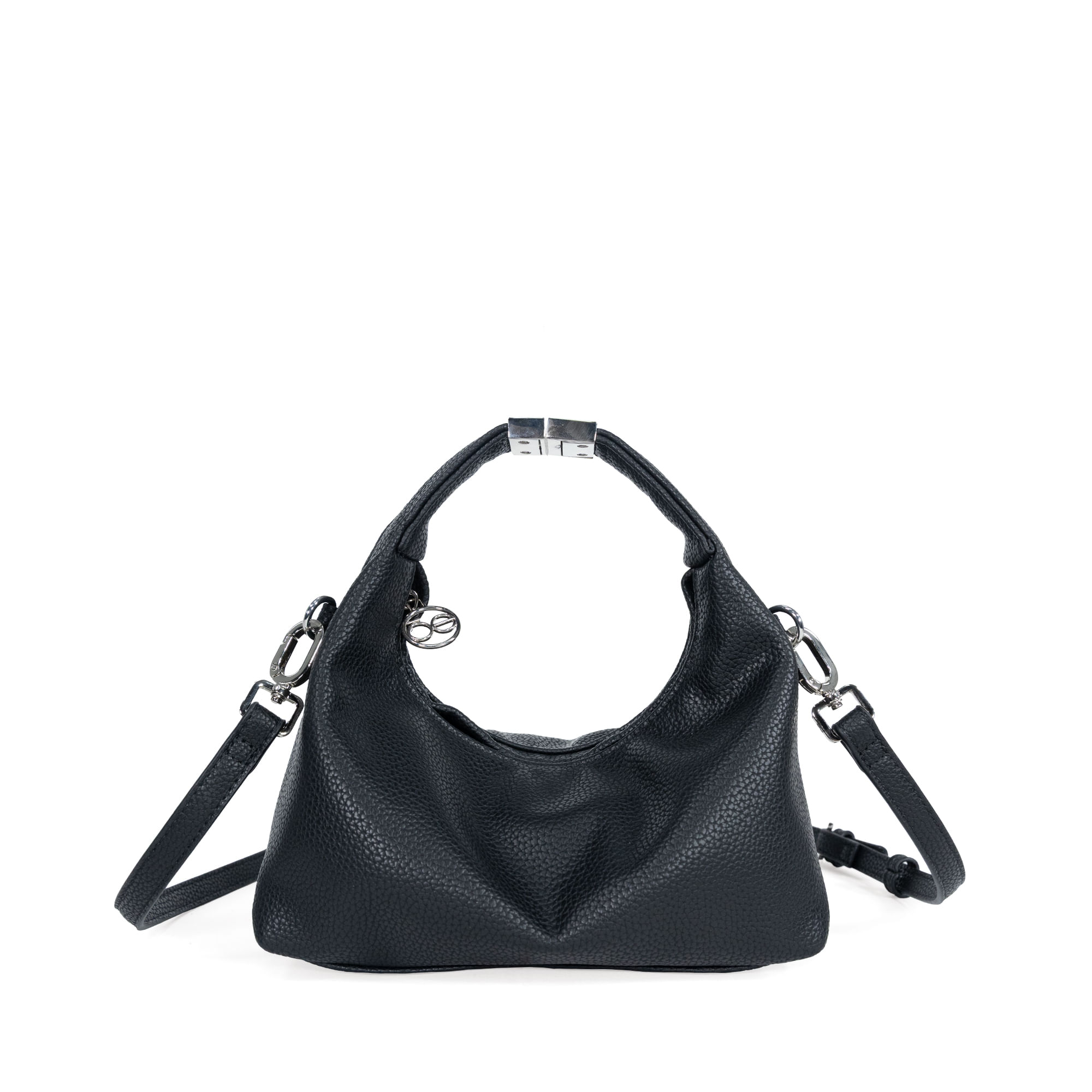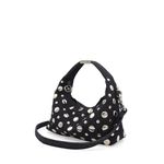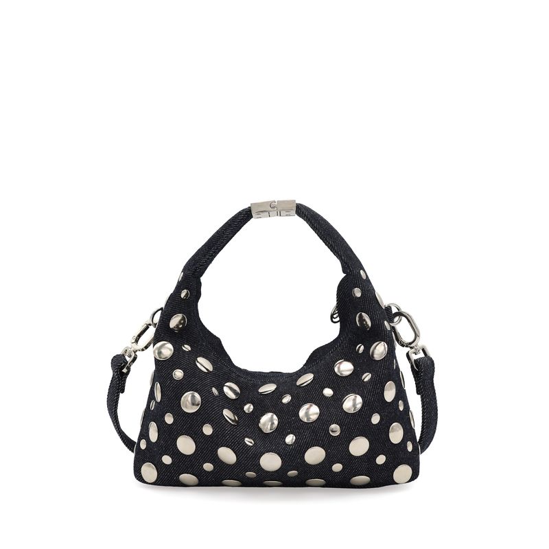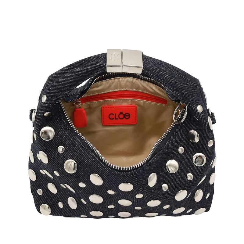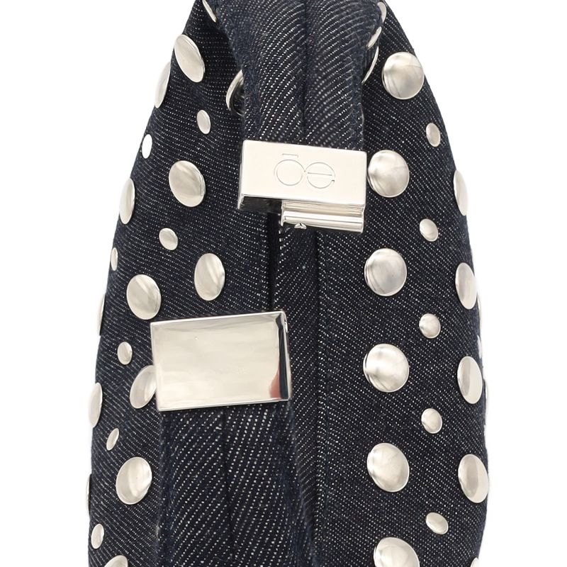 Bolso hecho con material denim. Cuenta con cierre de larga duración. Diseño con aplicación de estoperoles. Asa de mano con broche metálico de mejor apertura. Asa larga ajustable y removible.