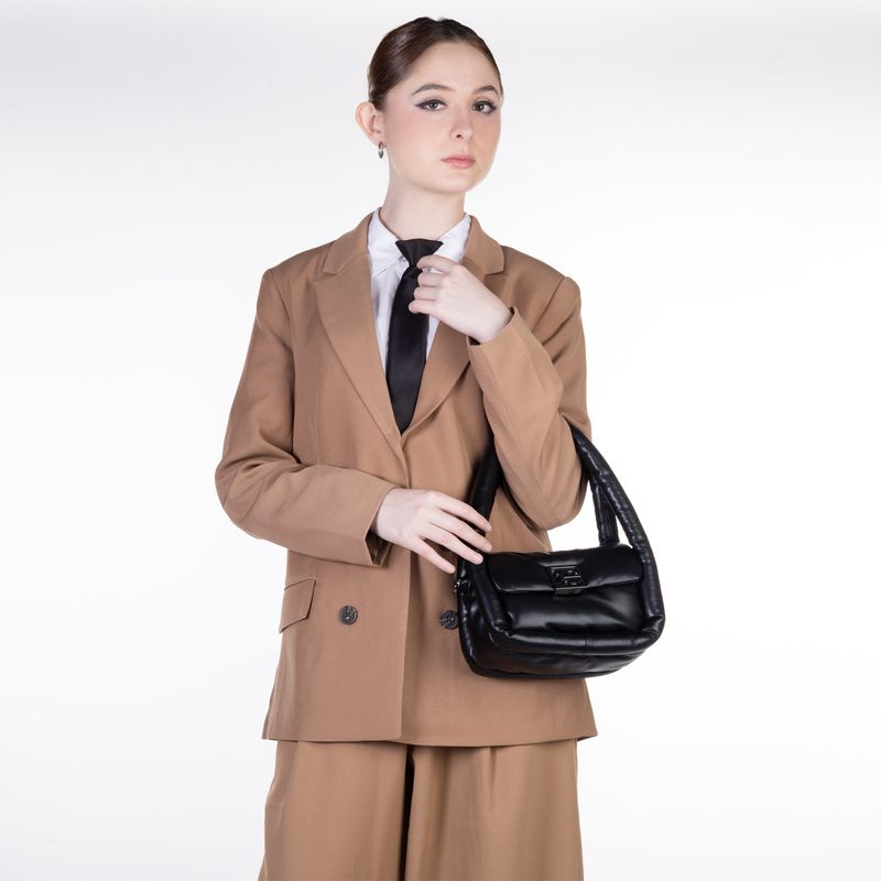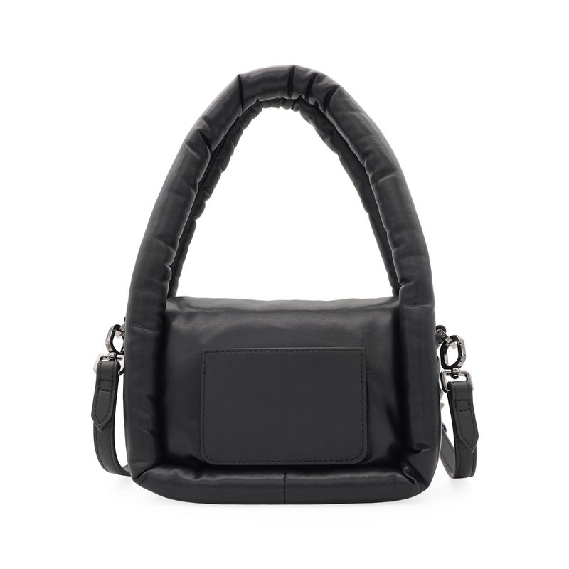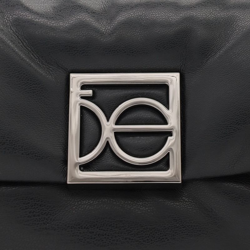 Bolso hecho con material vegano apariencia piel. Cuenta con tapeta con broche magnético. Herraje metálico de monograma. Look puffy. Asa larga desprendible.