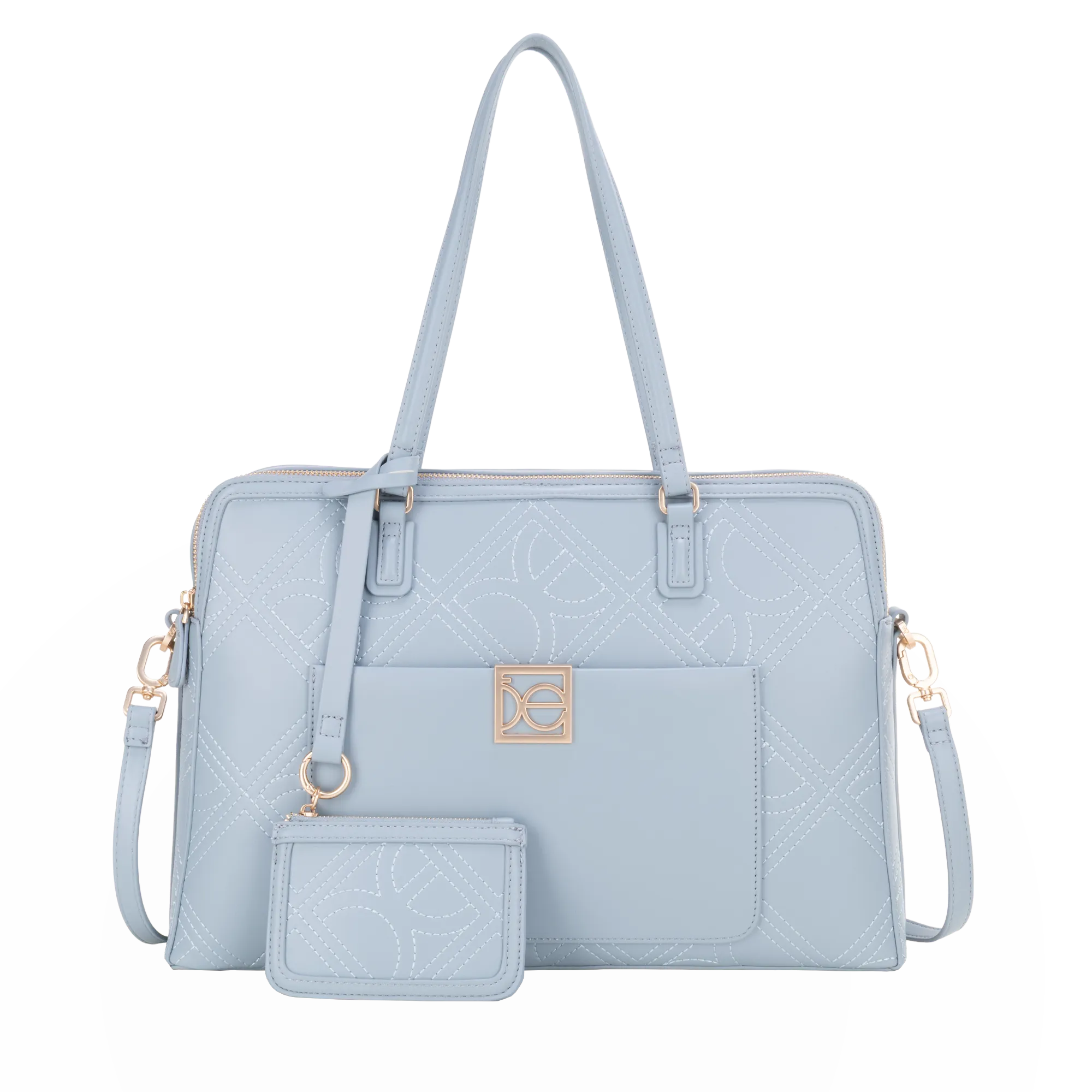 Bolso hecho con material vegano apariencia piel. Cuenta con cierre metálico de larga duración. Diseño bordado de monograma. Porta laptop de 14 plg. Compartimento frontal de fácil acceso. Compartimento posterior con cierre. Monedero desprendible. Asa larga ajustable y removible.