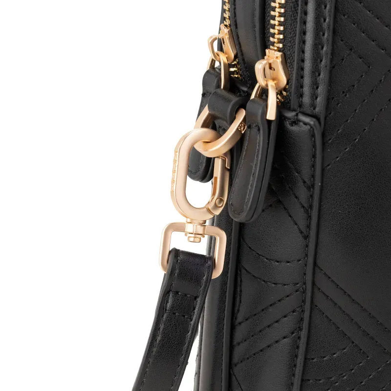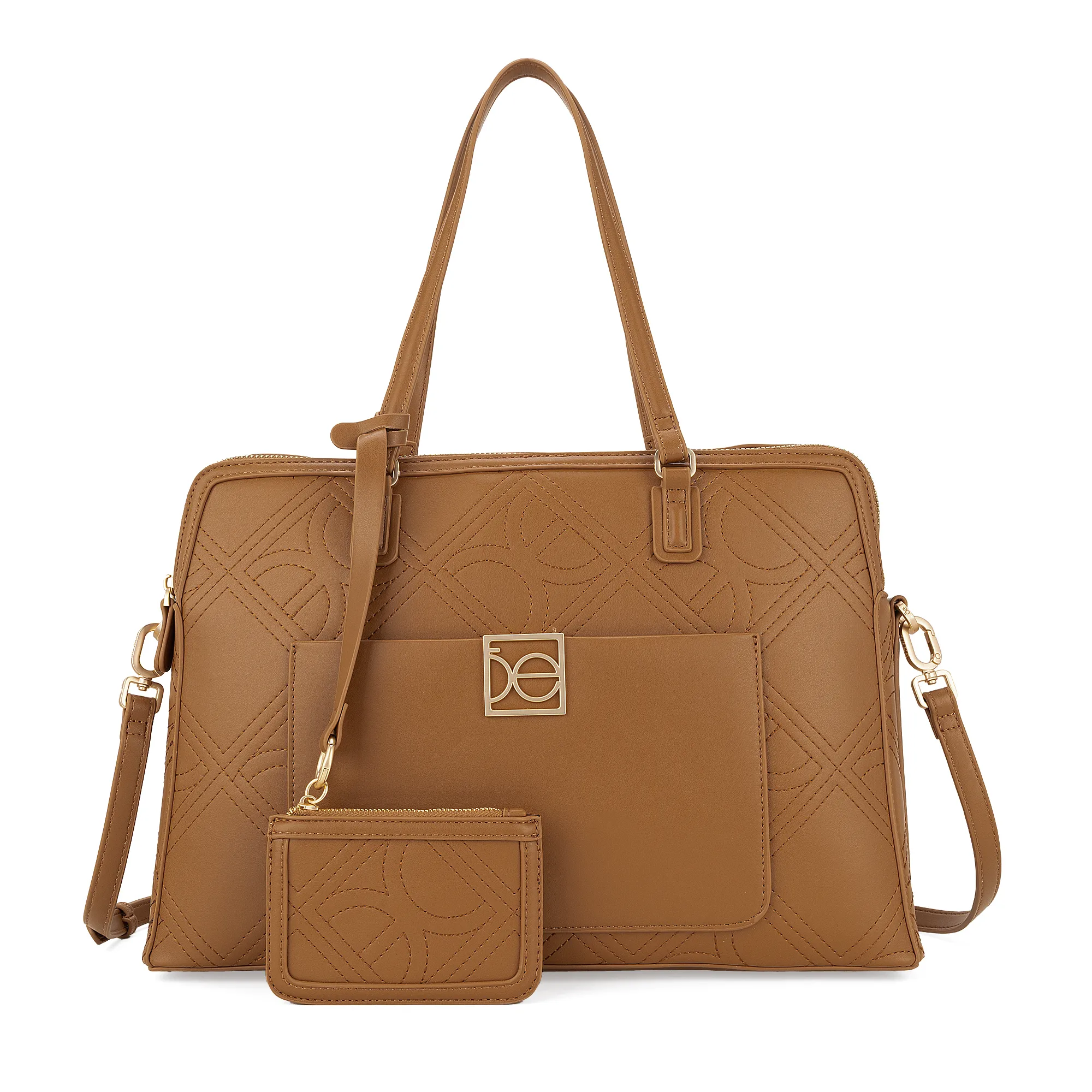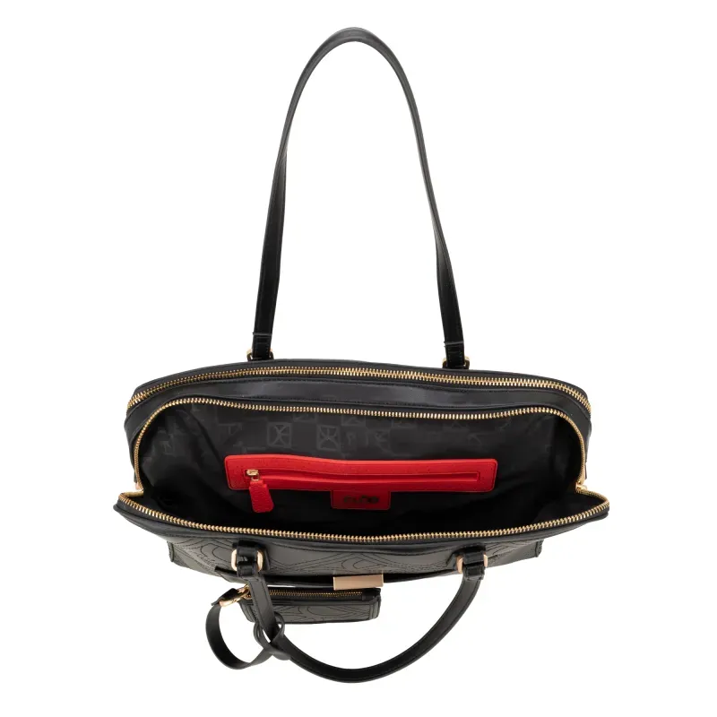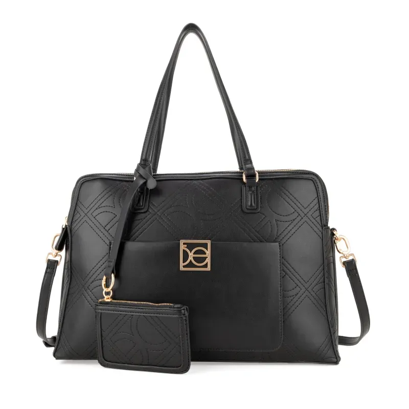 Bolso hecho con material vegano apariencia piel. Cuenta con cierre metálico de larga duración. Diseño bordado de monograma. Porta laptop de 14 plg. Compartimento frontal de fácil acceso. Compartimento posterior con cierre. Monedero desprendible. Asa larga ajustable y removible.