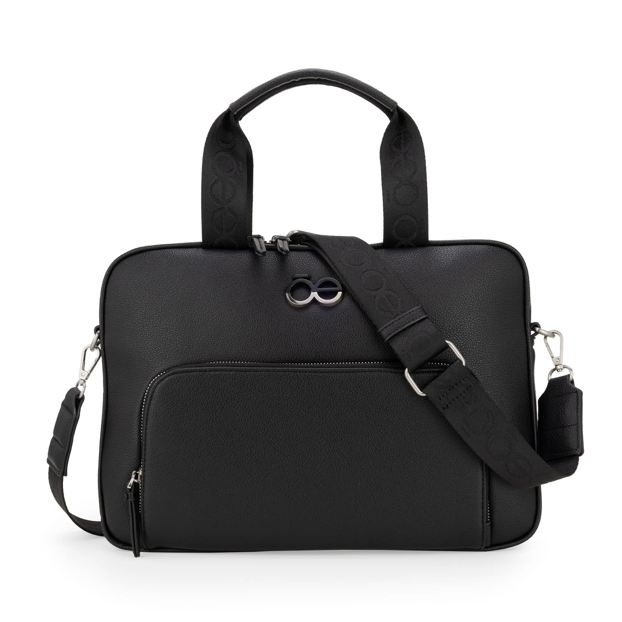 Bolso porta laptop hecho con material vegano apariencia piel. Cuenta con cierre metálico de larga duración. Tiene herraje de monograma. Compartimento interno acolchado para laptop 15". Asa larga ajustable y removible.