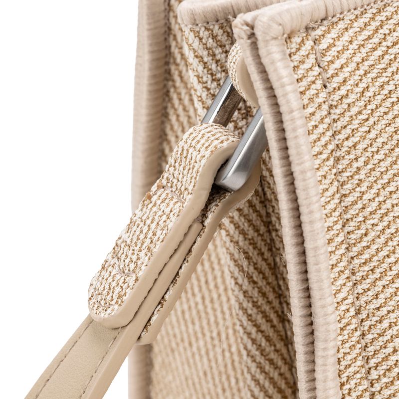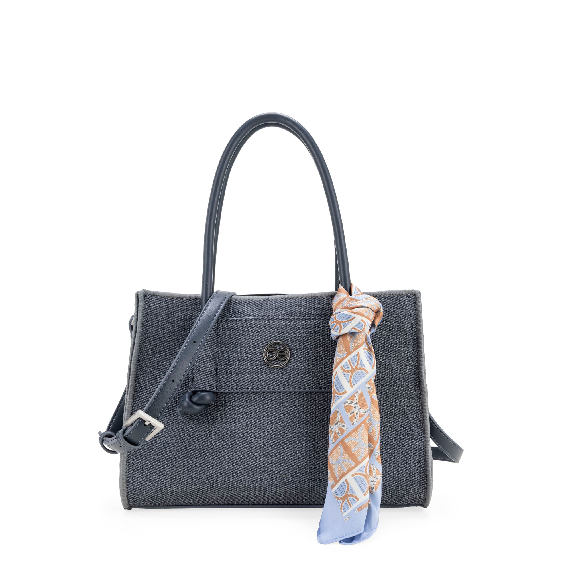 Bolso hecho con material vegano apariencia textil. Cuenta con cierre métalico de larga duración. Herraje de monograma esmaltado al tono. Mascada multiusos removible. Asa larga ajustable.