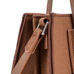 Bolso hecho con material vegano apariencia textil. Cuenta con cierre métalico de larga duración. Herraje de monograma esmaltado al tono. Mascada multiusos removible. Asa larga ajustable.