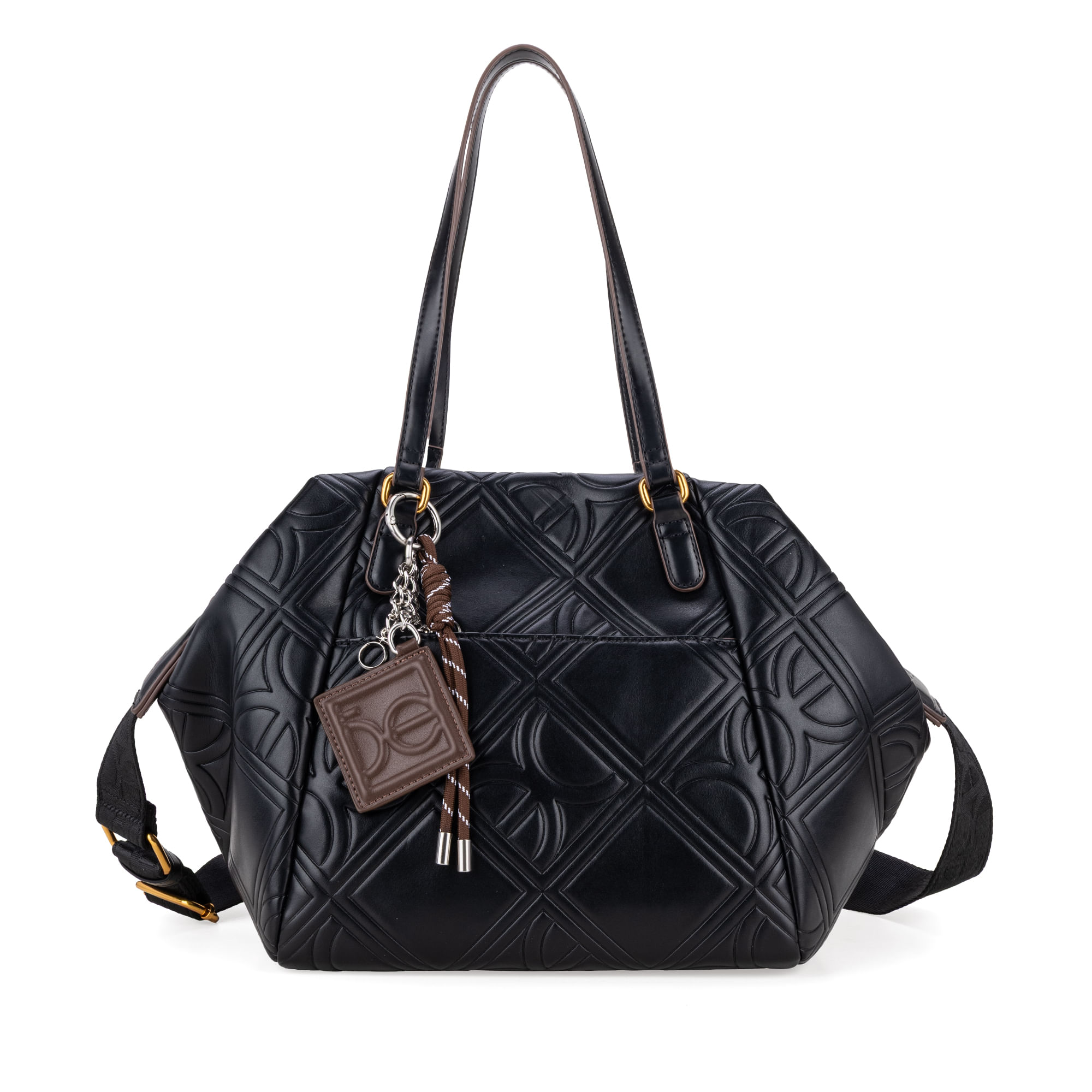 Bolso Satchel hecho con material vegano apariencia piel. Cuenta con bordado de monograma. Tiene cierre metálico de larga duración. Amplia apertura. Incluye Charm desprendible. Asa larga ajustable y removible.