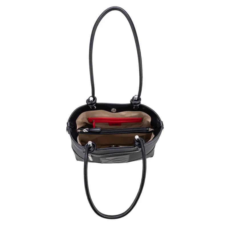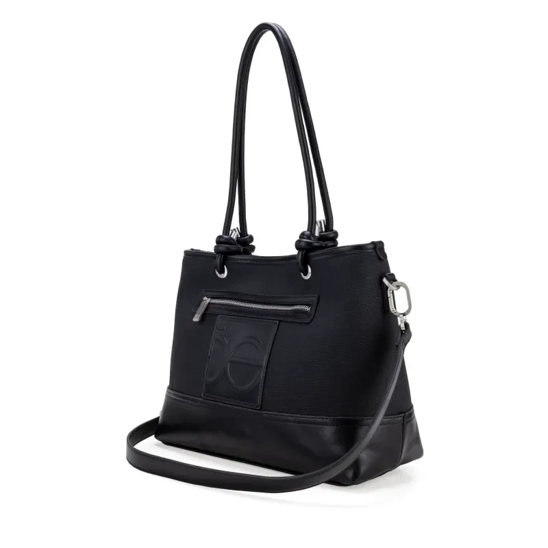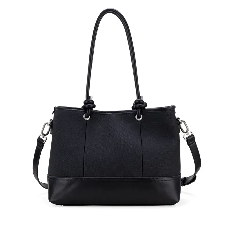 Bolso Satchel hecho con material vegano look textil. Cuenta con cierre metálico de larga duración. Asas de hombro reforzadas con detalles de nudos decorativos. Compartimento frontal con cierre. Asa larga ajustable y removible.