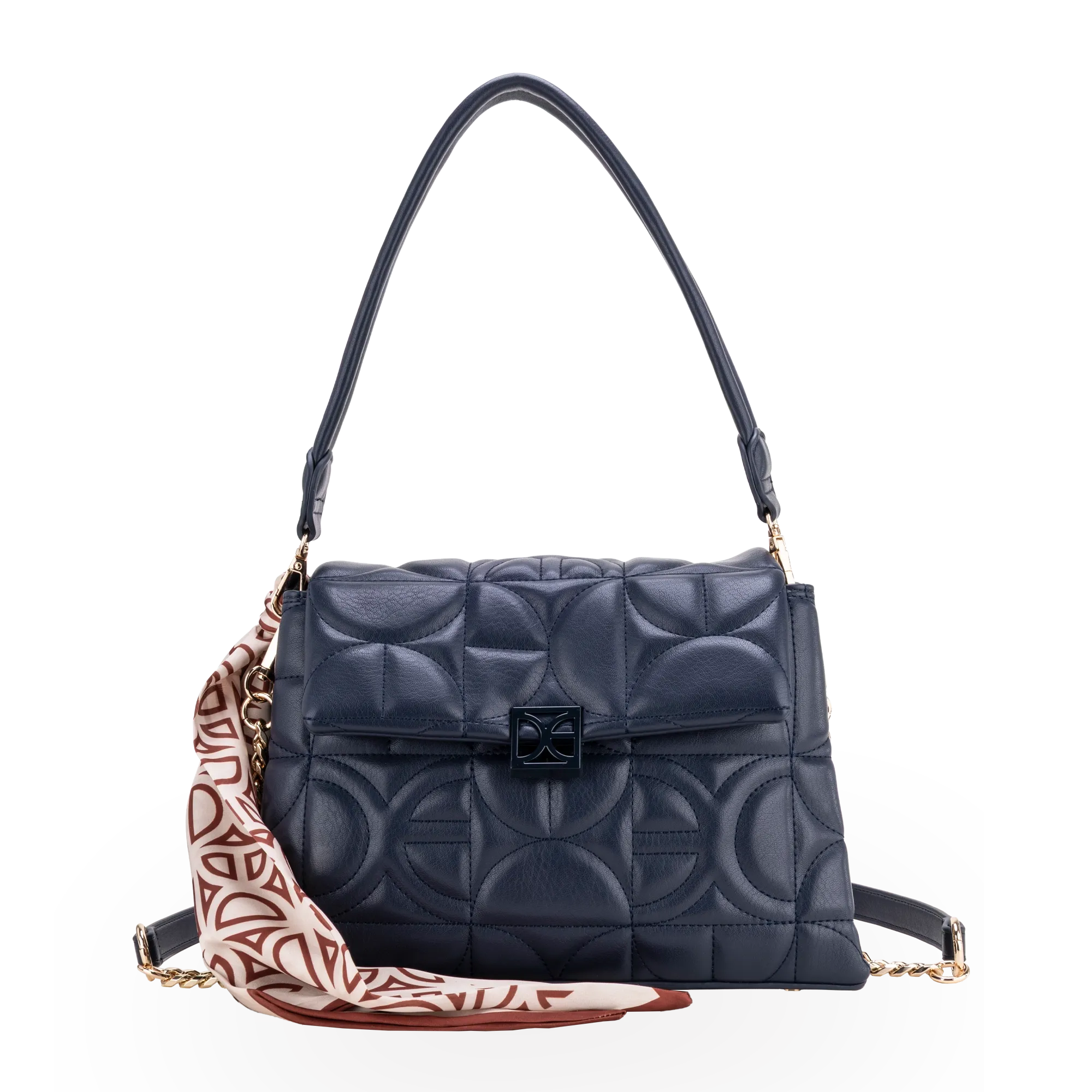 Bolso Satchel hecho con material vegano. Cuenta con mascada multiusos removible. Herraje metálico de monograma. Asa larga removible