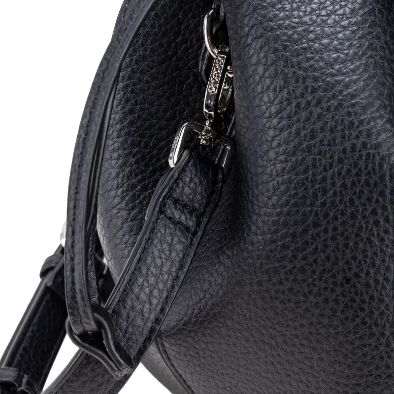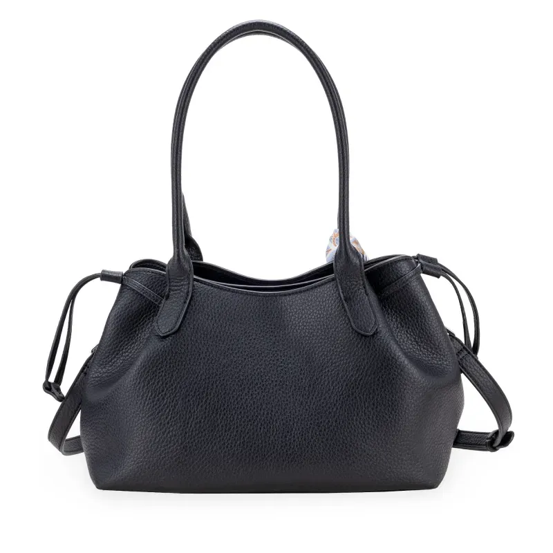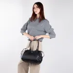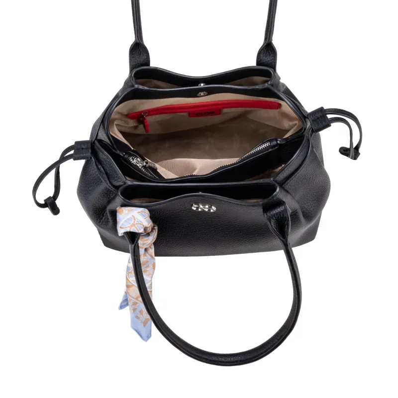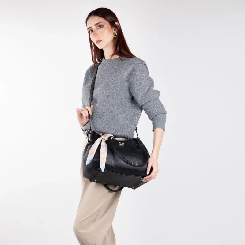 Bolso Satchel hecho con material vegano apariencia piel. Cuenta con cierre metálico de larga duración. Cuenta con herraje metálico de monograma. Jaretas laterales. Incluye mascada multiusos desprendible. Asa larga ajustable y removible.