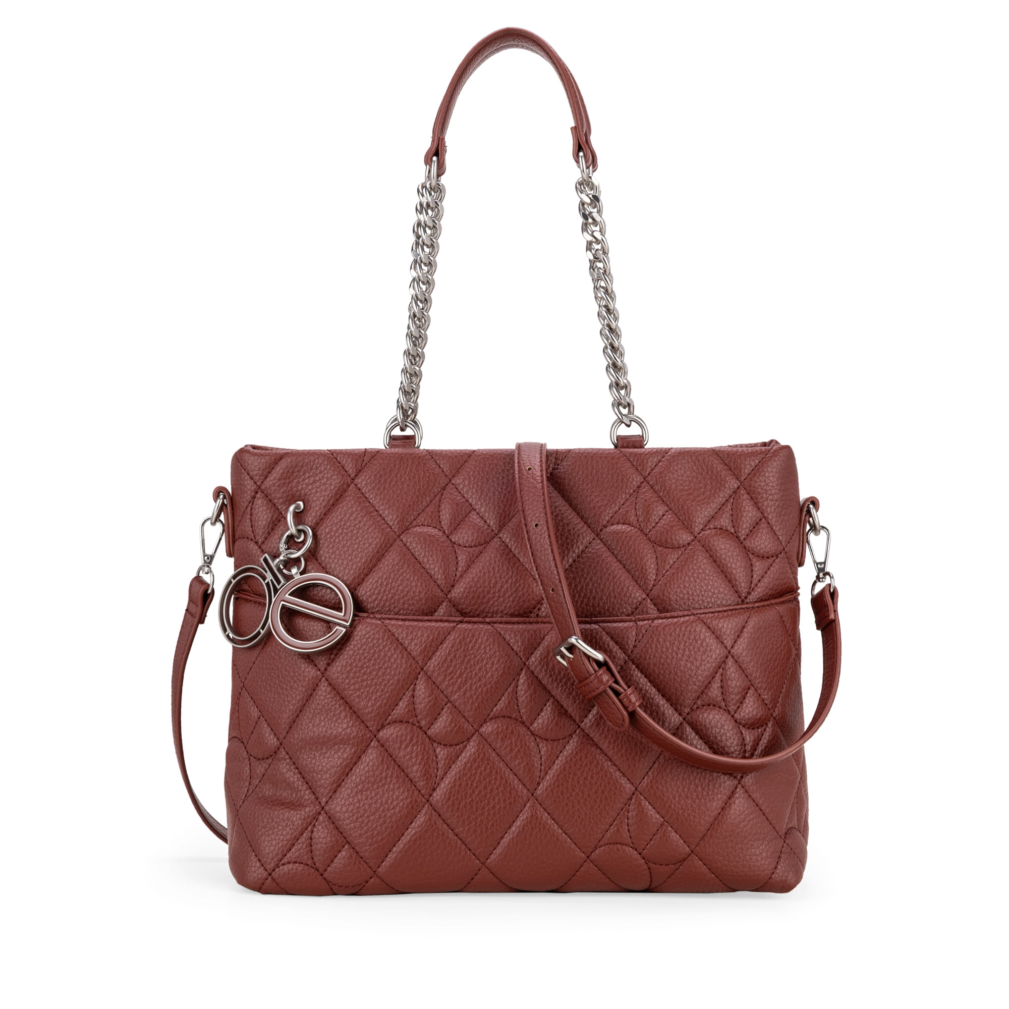 Bolso Tote hecho con material vegano apariencia piel. Cuenta con diseño de rombos bordados. Tiene cierre metálico de larga duración. Incluye charm decorativo desprendible. Asa larga ajustable y removible.