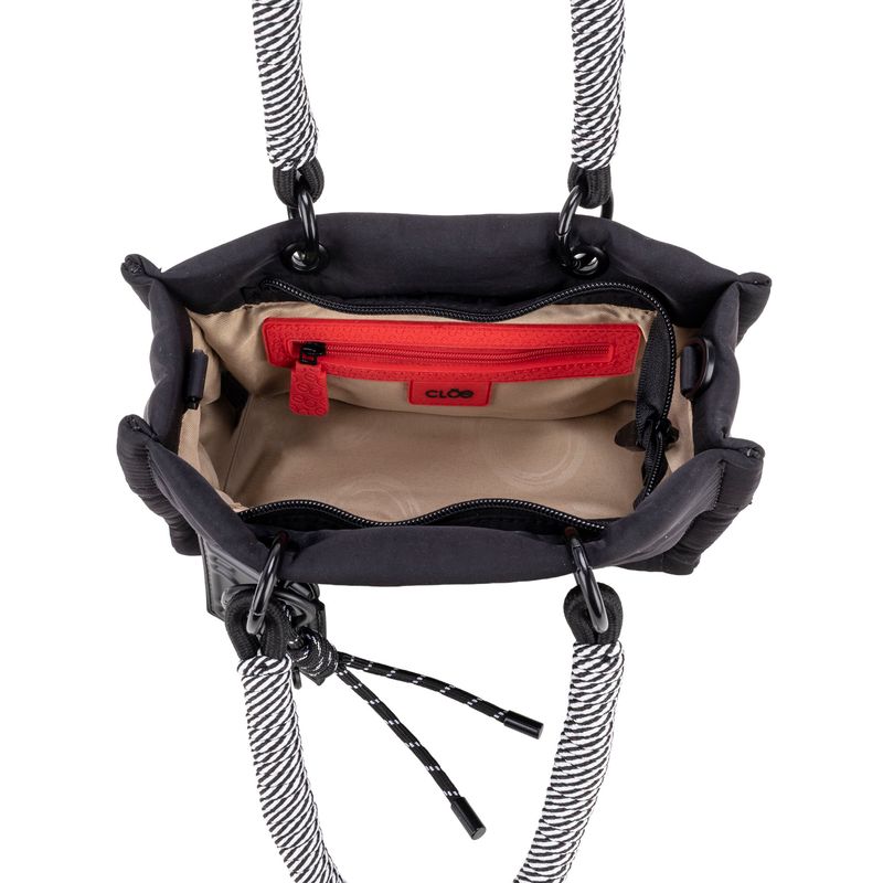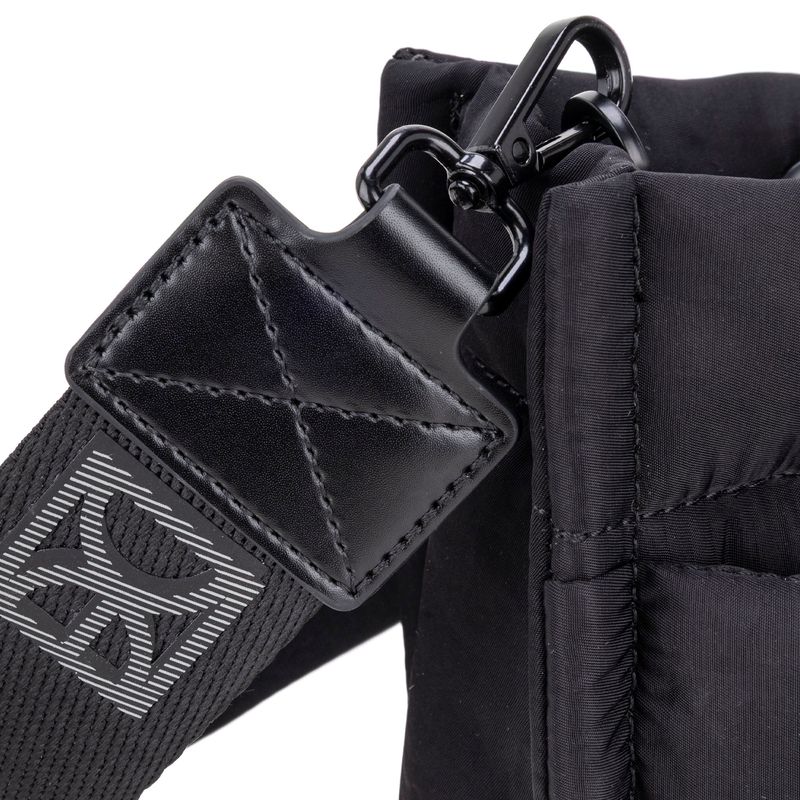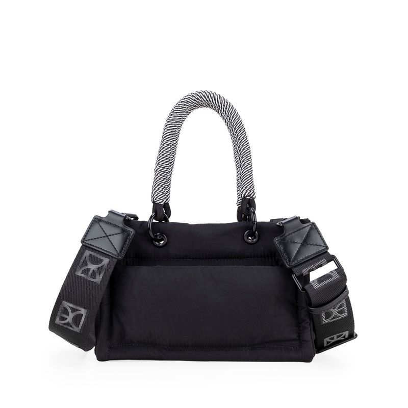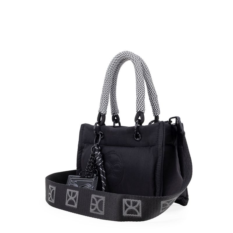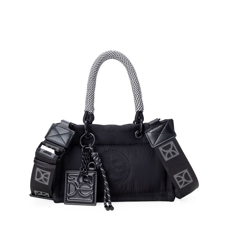 Bolso Tote hecho con material textil. Cuenta con diseño acolchado de alta tendencia. Tiene cierre metálico de larga duración. Charm decorativo desprendible. Asa larga ajustable y removible.