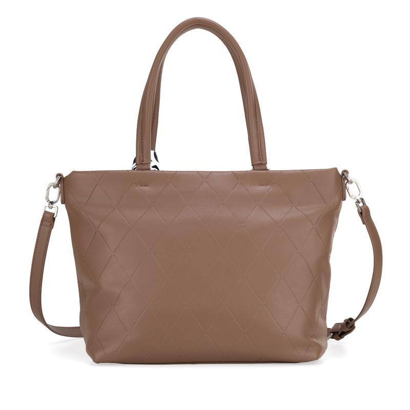 Bolso Tote hecho con material vegano apariencia piel. Cuenta con cierre metálico de larga duración. Diseño de troquelado a rombos. Herraje metálico de monograma. Incluye mascada multiusos desprendible. Asa larga ajustable.