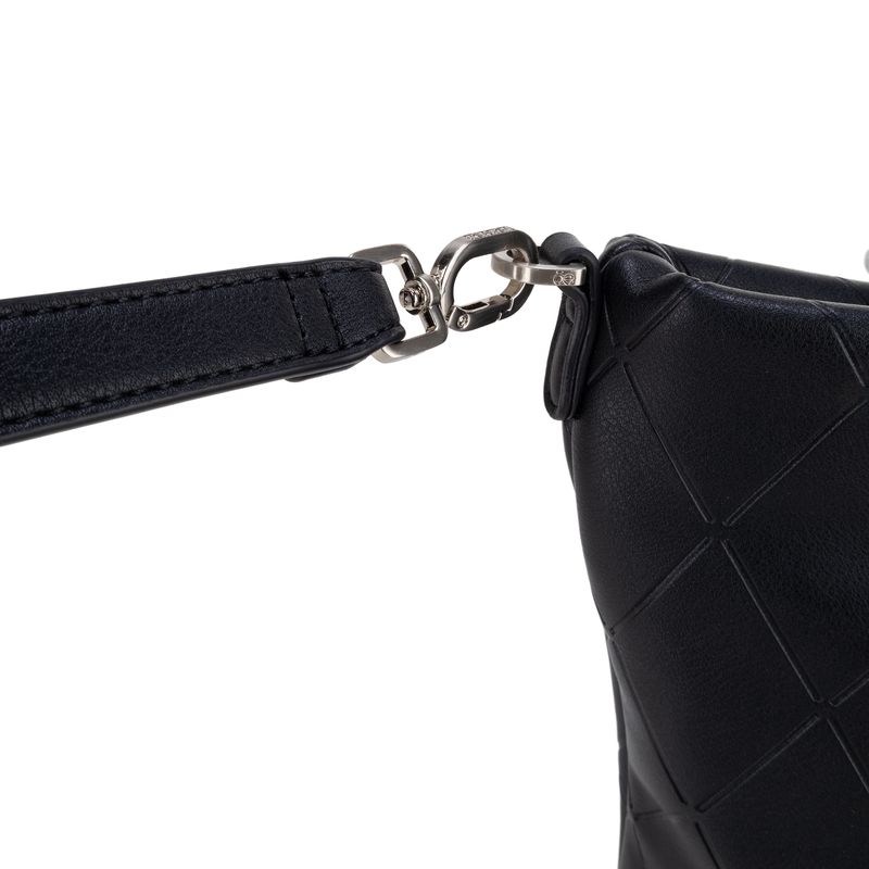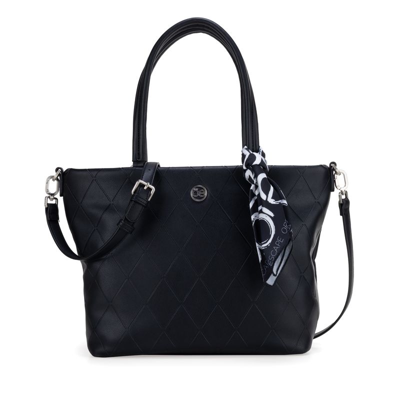 Bolso Tote hecho con material vegano apariencia piel. Cuenta con cierre metálico de larga duración. Diseño de troquelado a rombos. Herraje metálico de monograma. Incluye mascada multiusos desprendible. Asa larga ajustable.