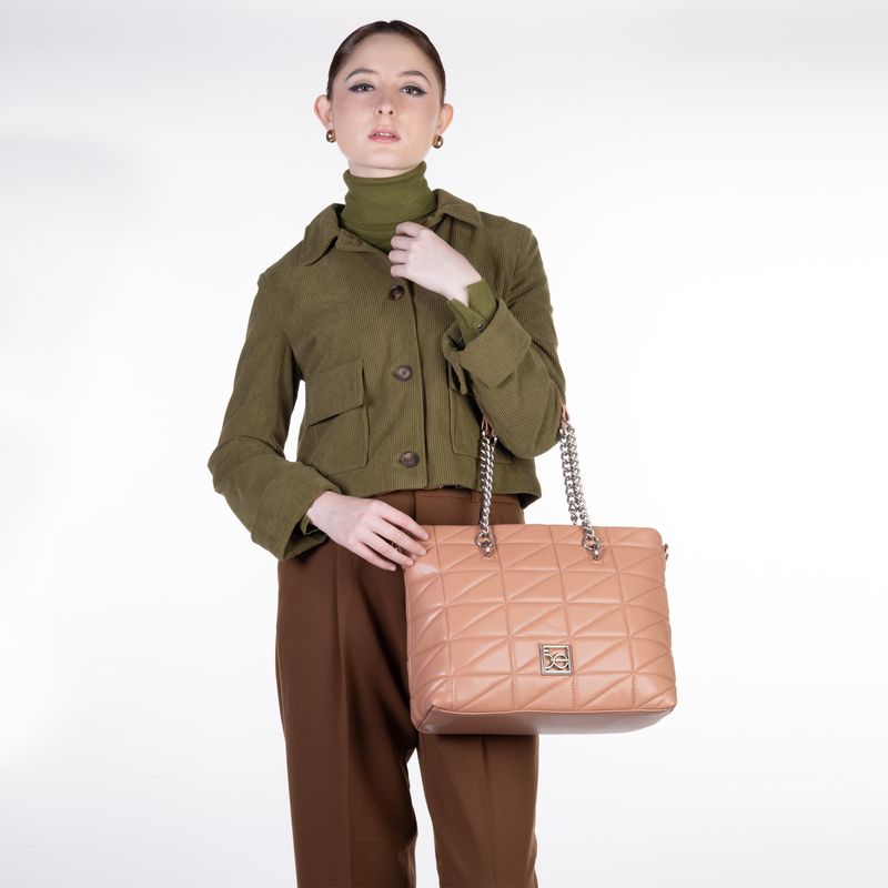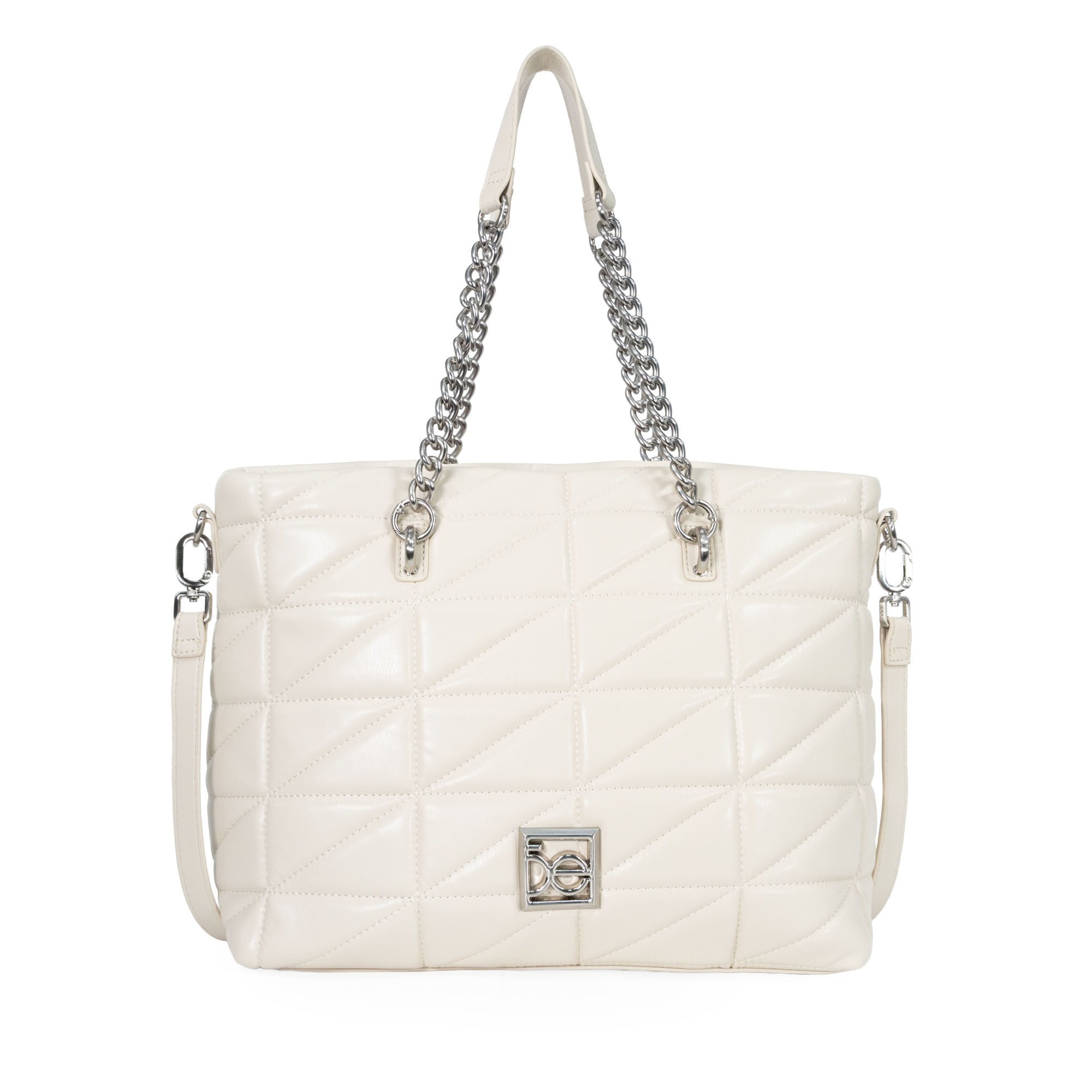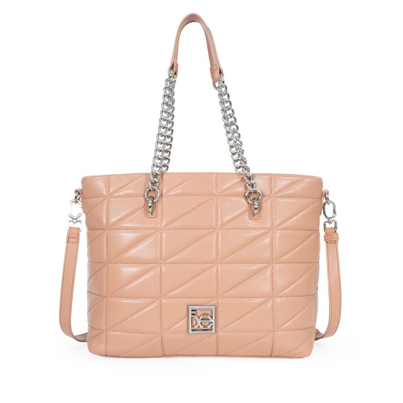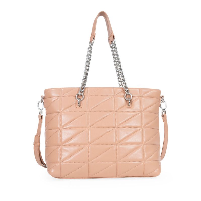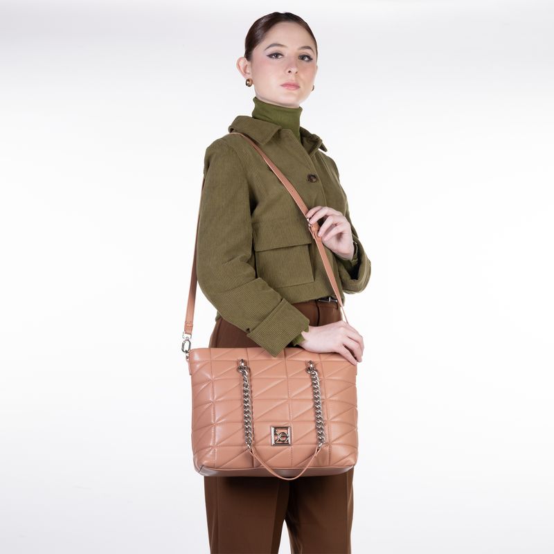 Bolso Tote hecho con material vegano apariencia piel. Cuenta con cierre metálico de larga duración. Herraje de monograma. Diseño acolchado con bordados geométricos. Asa larga ajustable y removible.